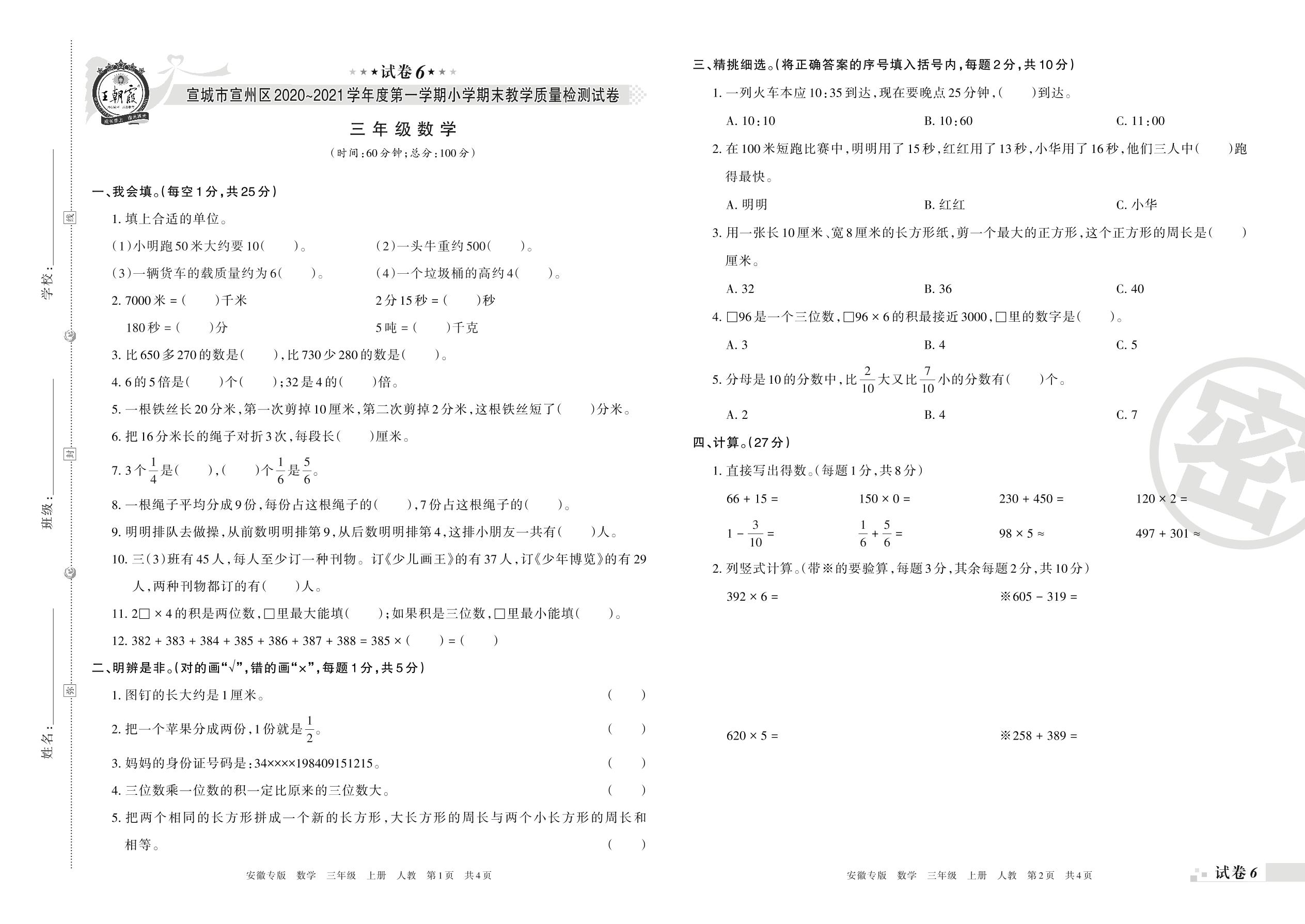 宣城市宣州区2020~2021学年度第一学期小学期末教学质量检测试卷三年级数学(人教版)【6】
