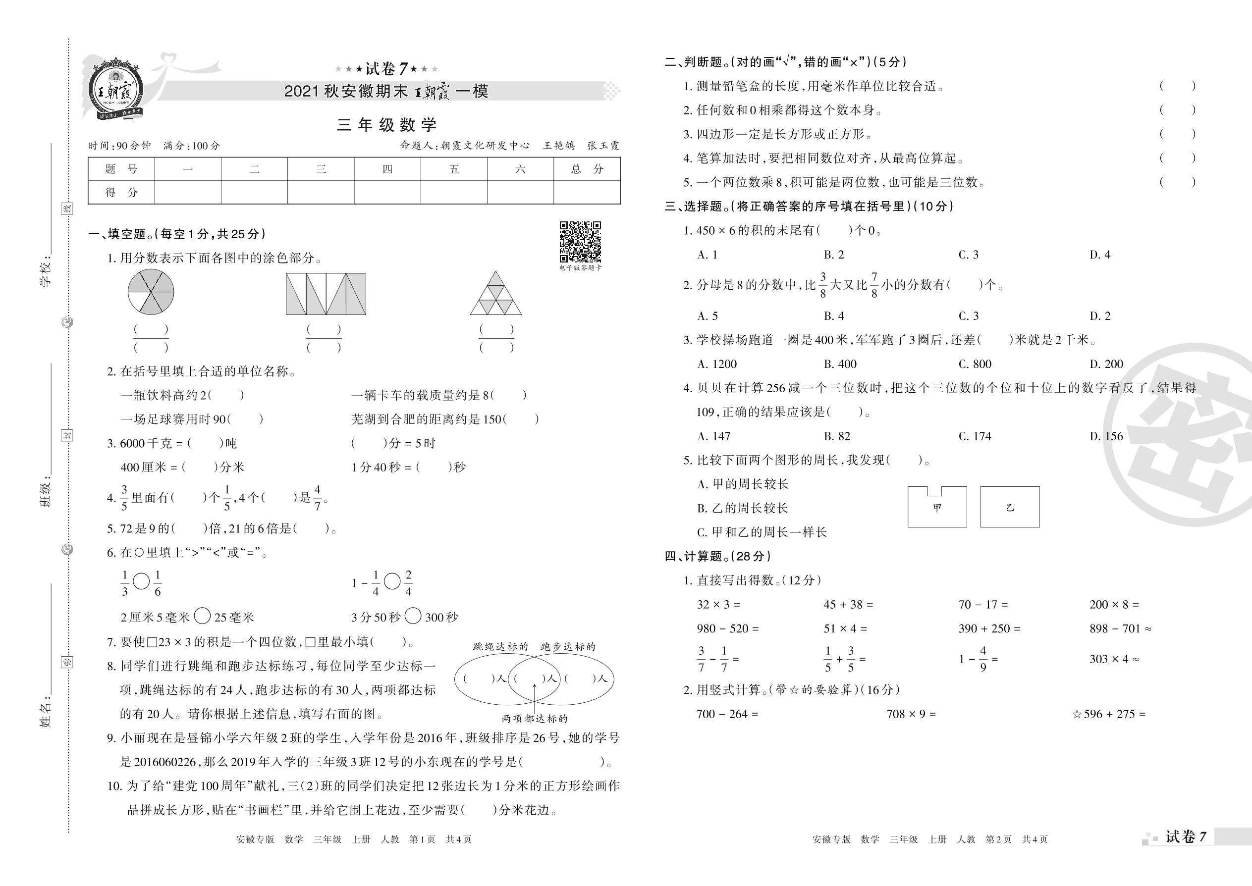 王朝霞期末模拟卷三年级上册数学(人教版)【7】