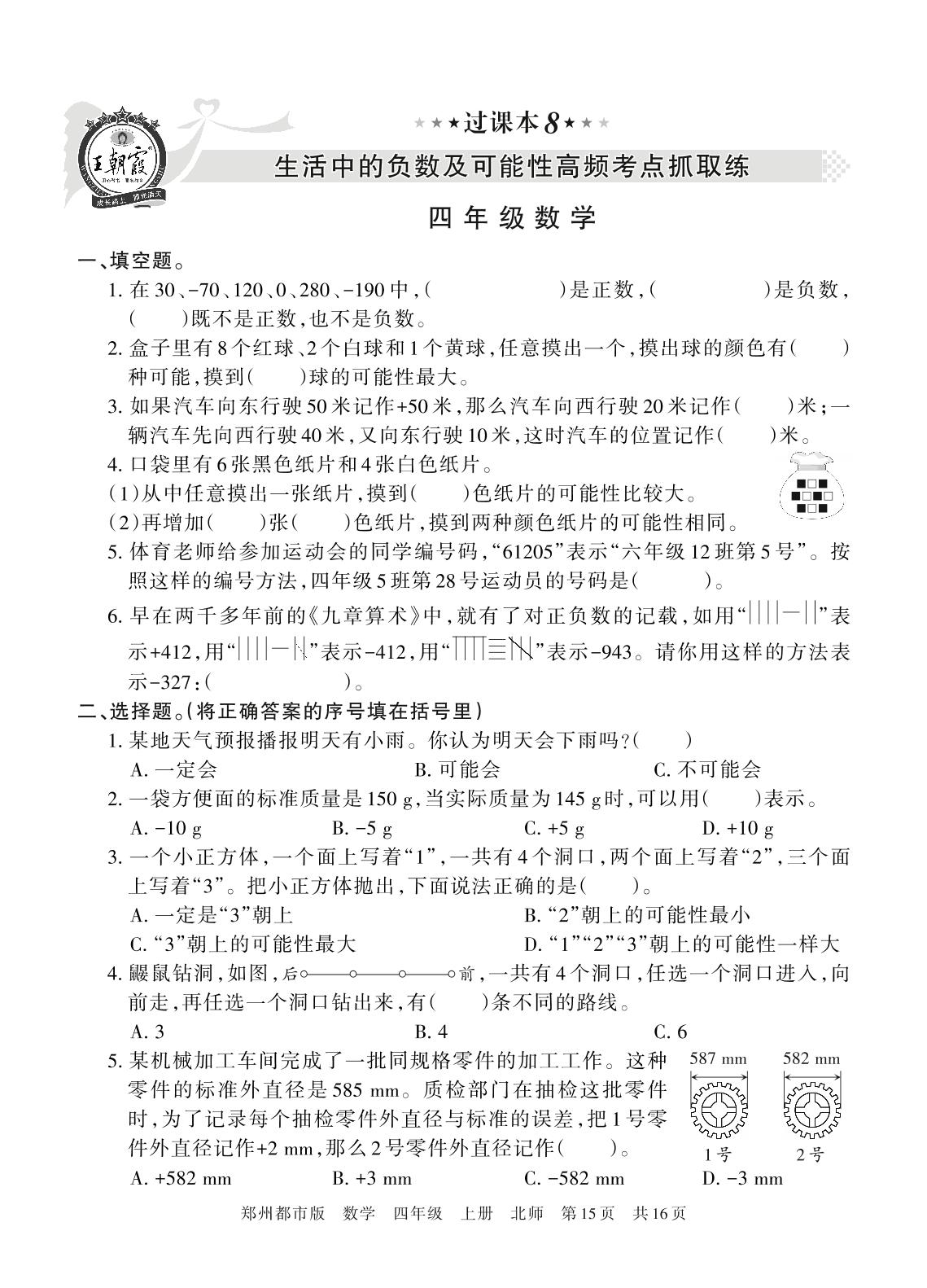 王朝霞期末过课本——生活中的负数及可能性高频考点抓取练四年级上册数学(北师版)_R211223104351353【8】