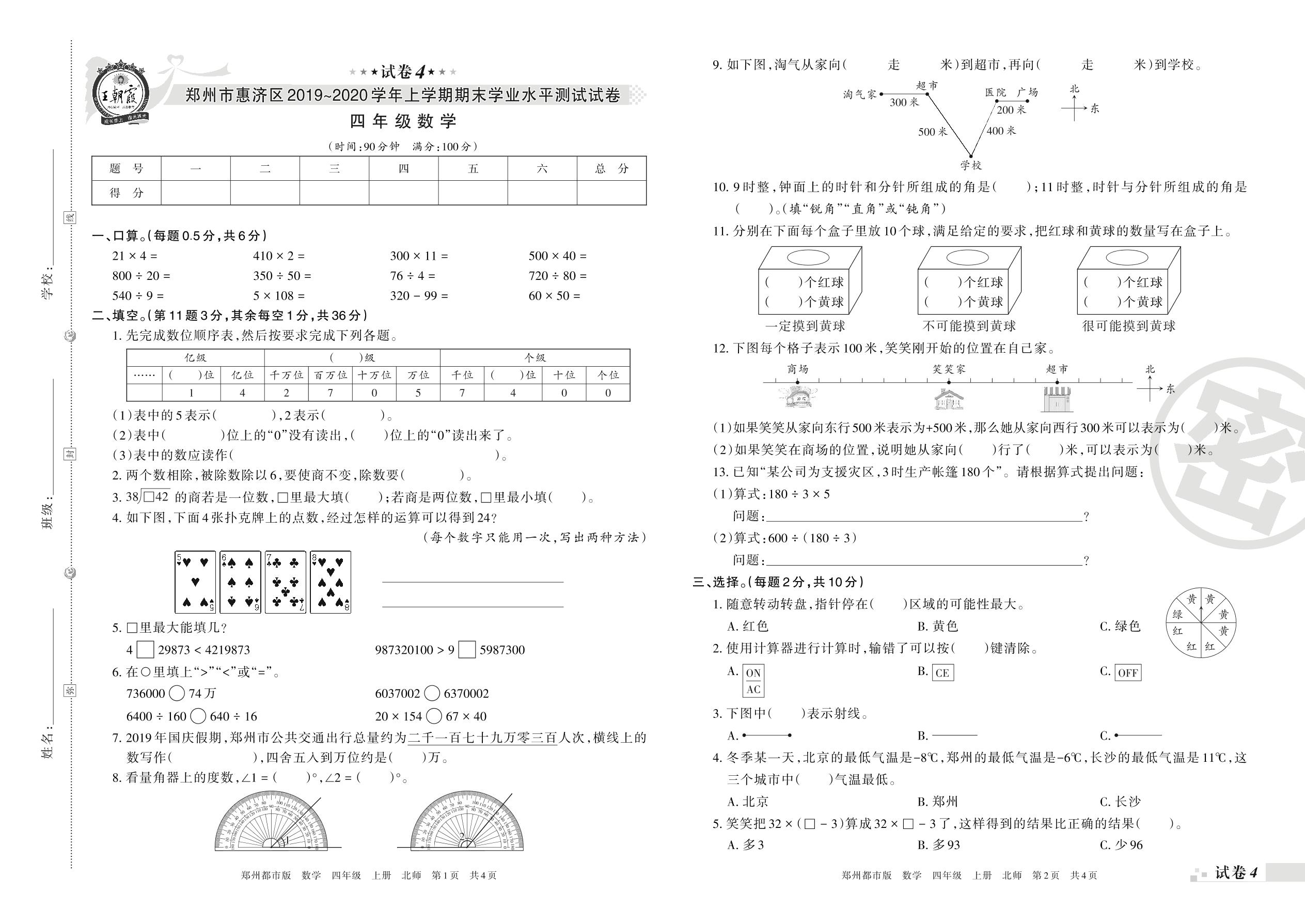 郑州市惠济区2019~2020学年上学期期末学业水平测试试卷四年级数学(北师版)【4】
