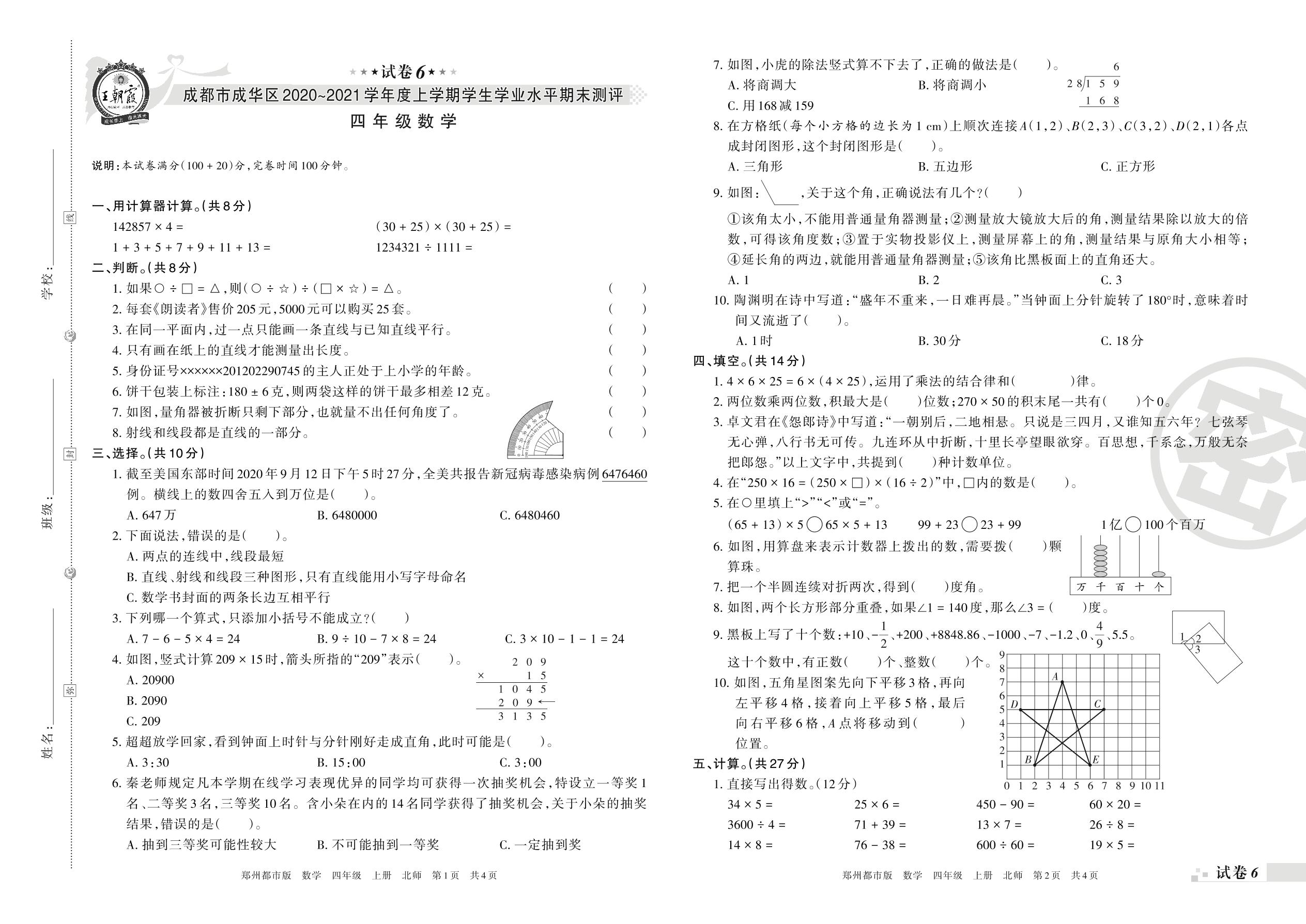 成都市成华区2020~2021学年度上学期学生学业水平期末测评四年级数学(北师版)【6】