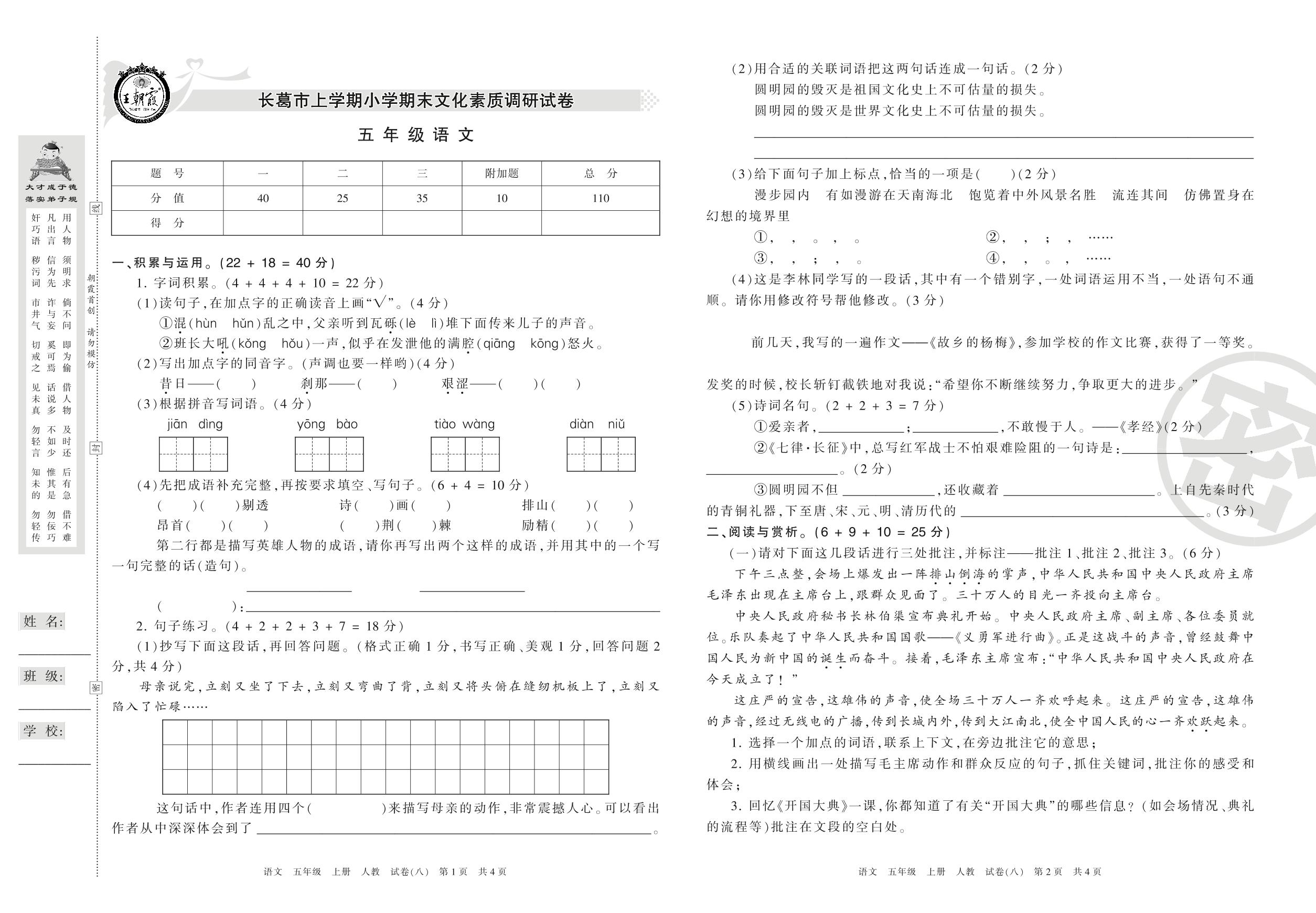 2016-2017学年第一学期长葛市五年级语文试卷(人教版)【8】