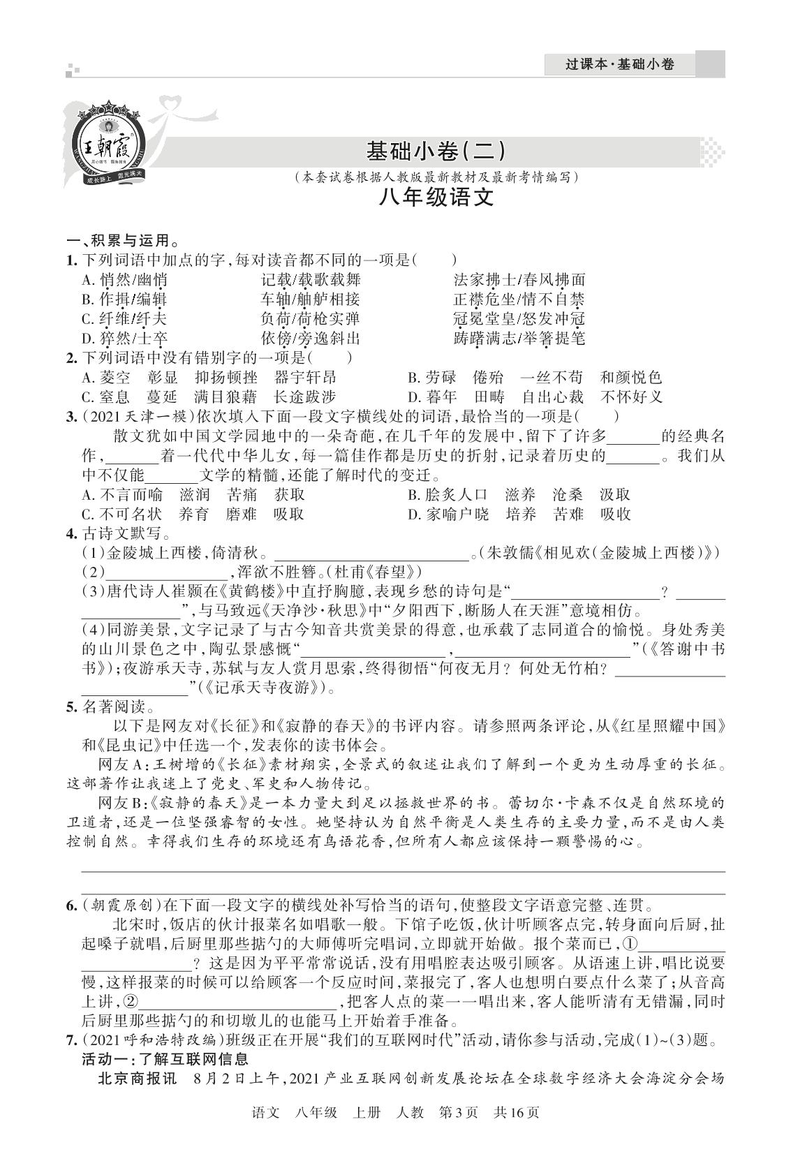 王朝霞期末过课本——基础小卷(二)八年级上册语文(人教版)【8】