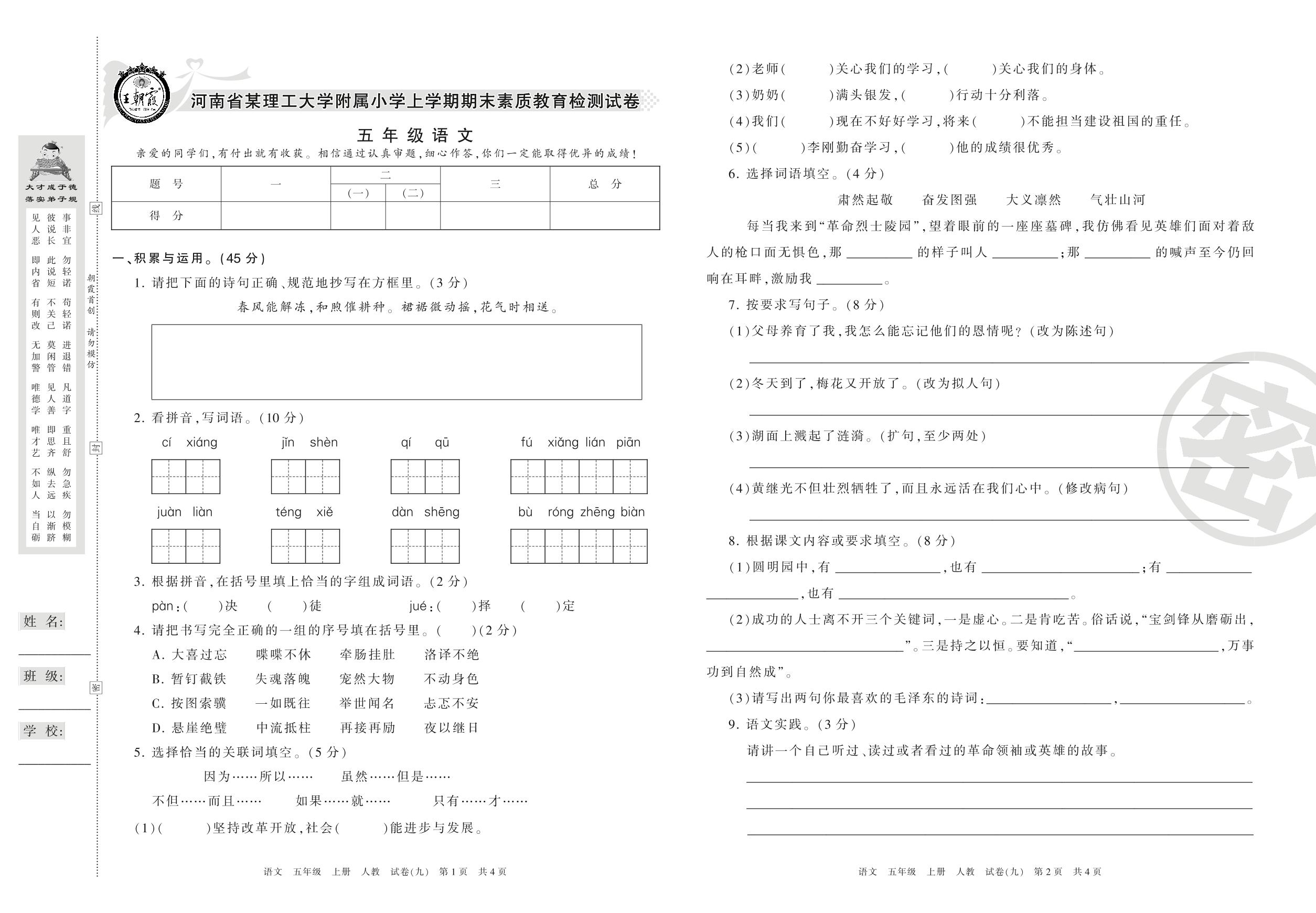 河南省某理工大学附属小学五年级上册语文(人教版)【9】