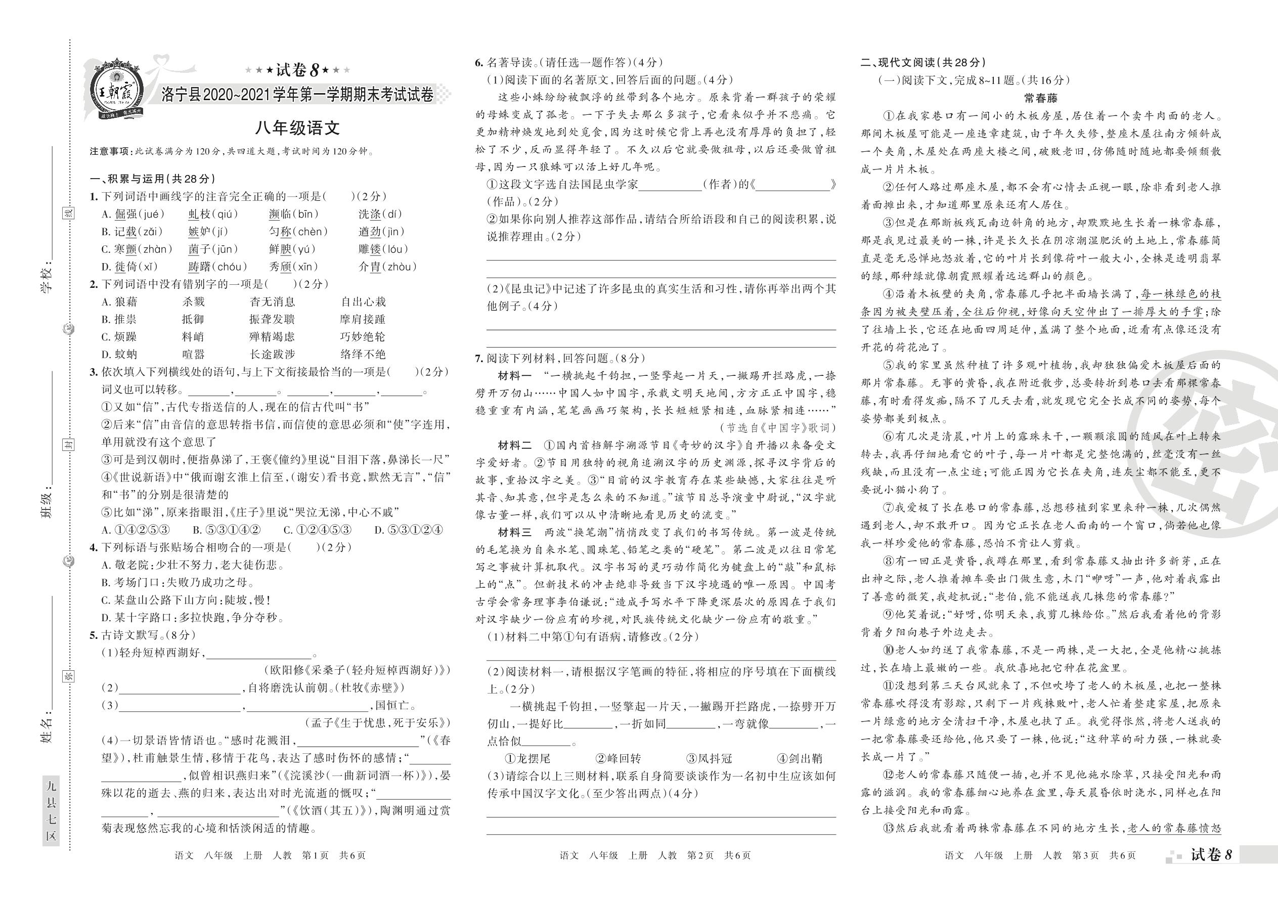 洛宁县2020~2021学年第一学期期末考试试卷八年级语文(人教版)【8】