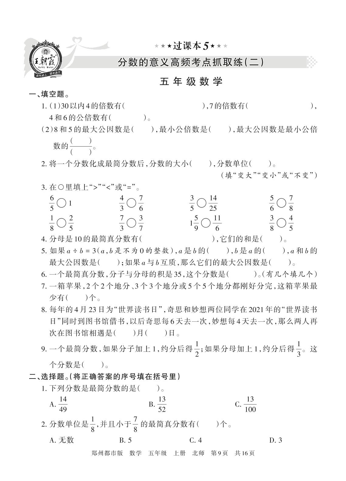 王朝霞期末过课本——分数的意义高频考点抓取练(二)五年级上册数学(北师版)_R211223104912920【5】