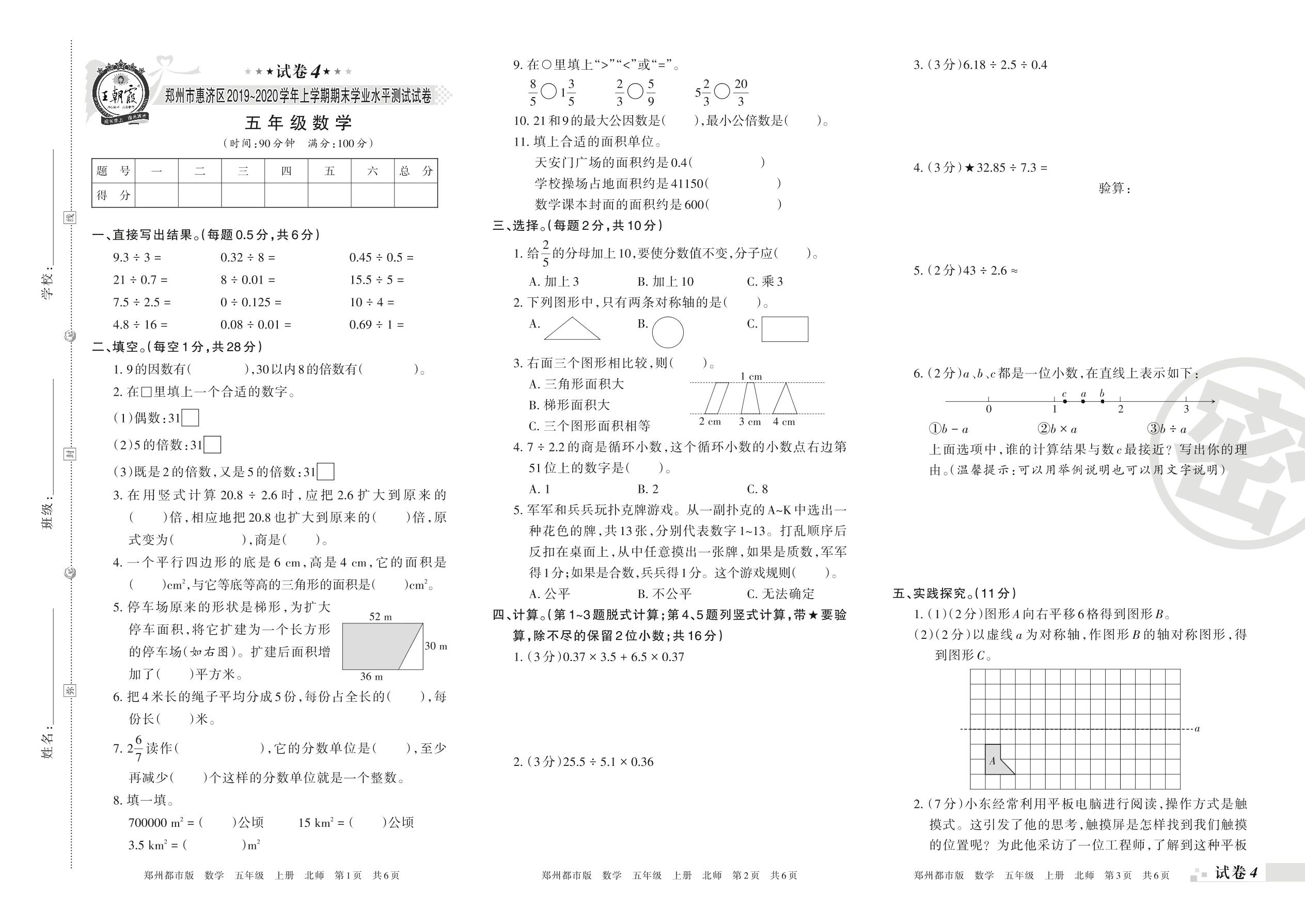 郑州市惠济区2019~2020学年上学期期末学业水平测试试卷五年级数学(北师版)【4】