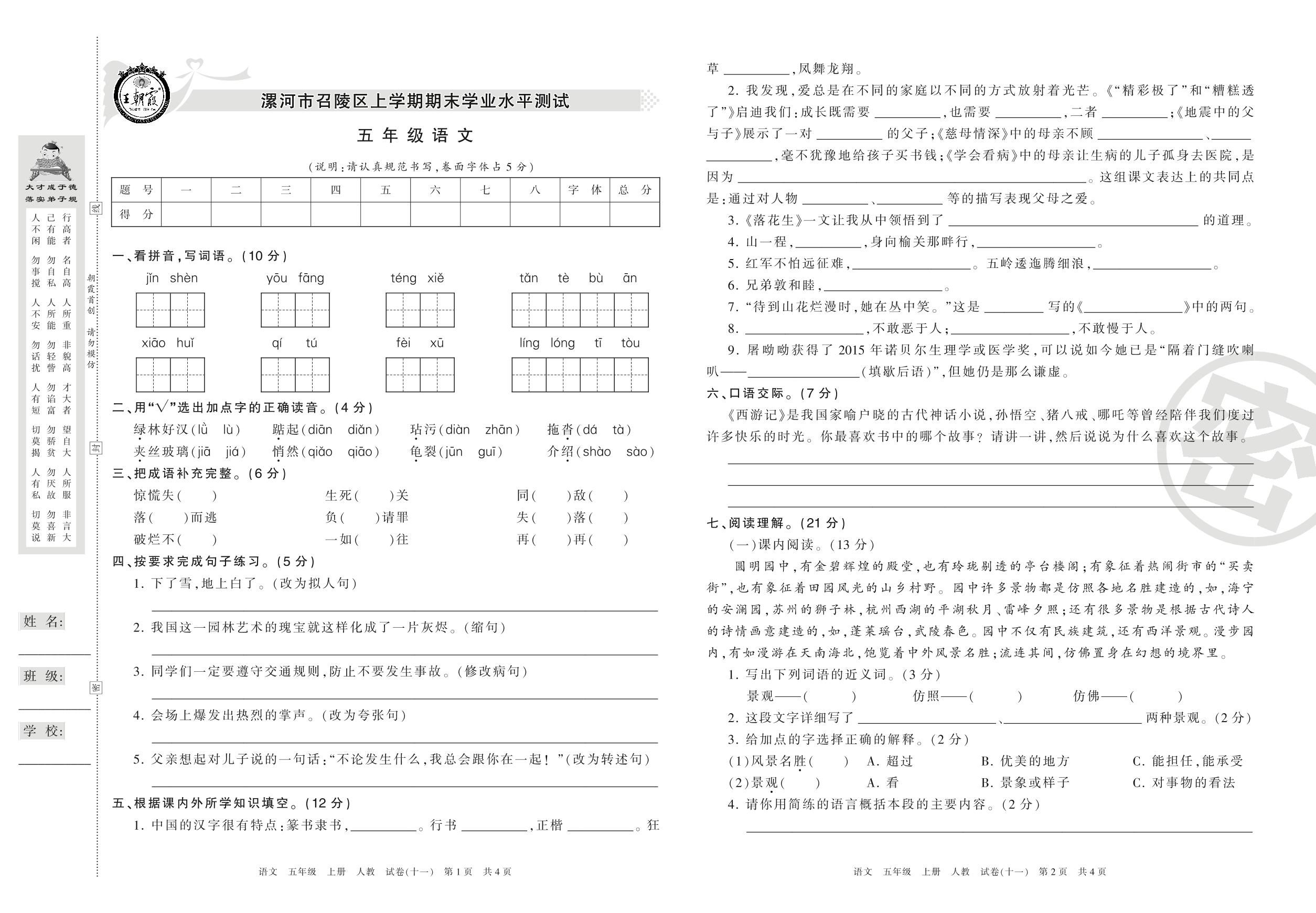 2016-2017学年第一学期漯河市召陵区五年级语文试卷(人教版)【11】