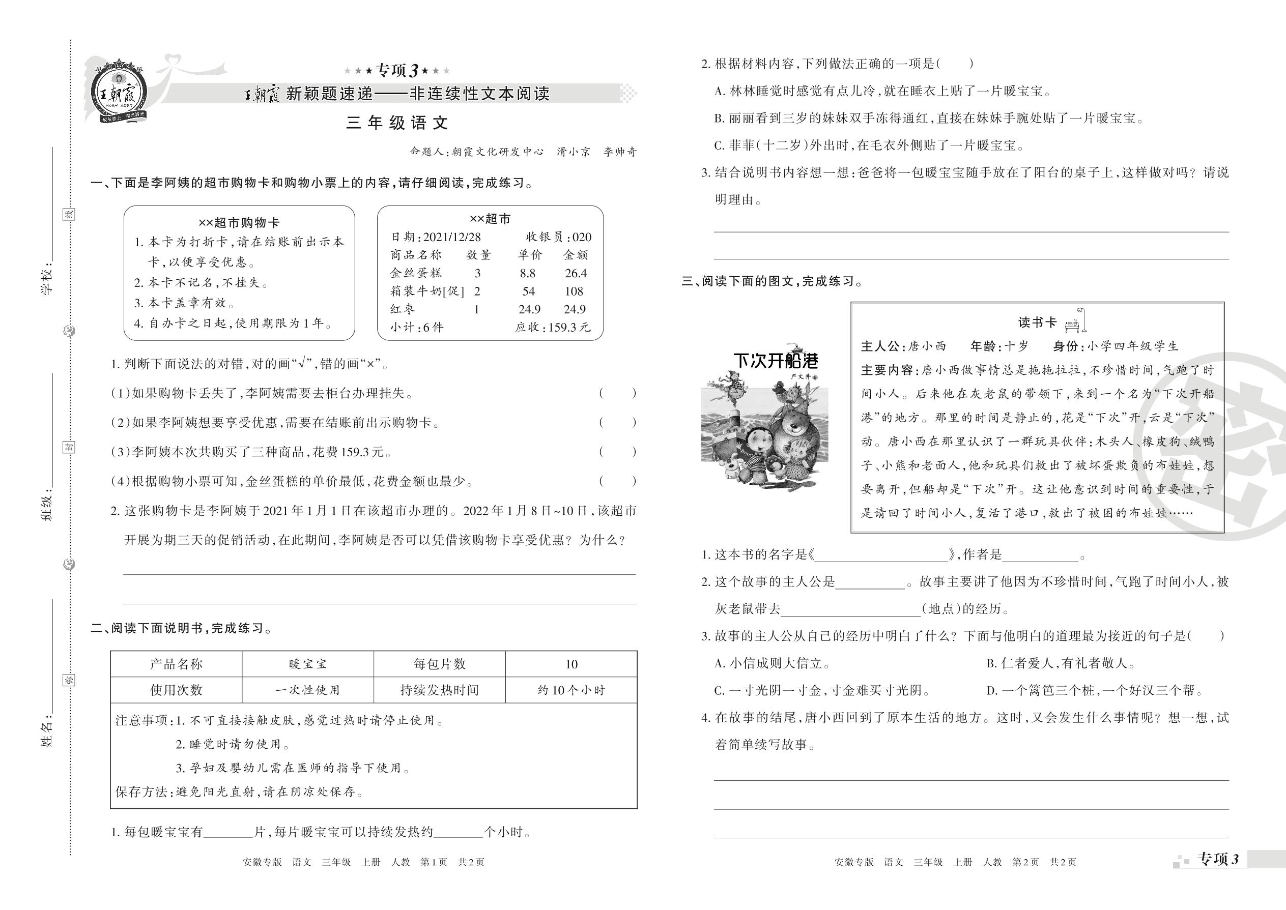 王朝霞期末专项卷——新颖题速递:非连续性文本阅读三年级上册语文(人教版)【3】