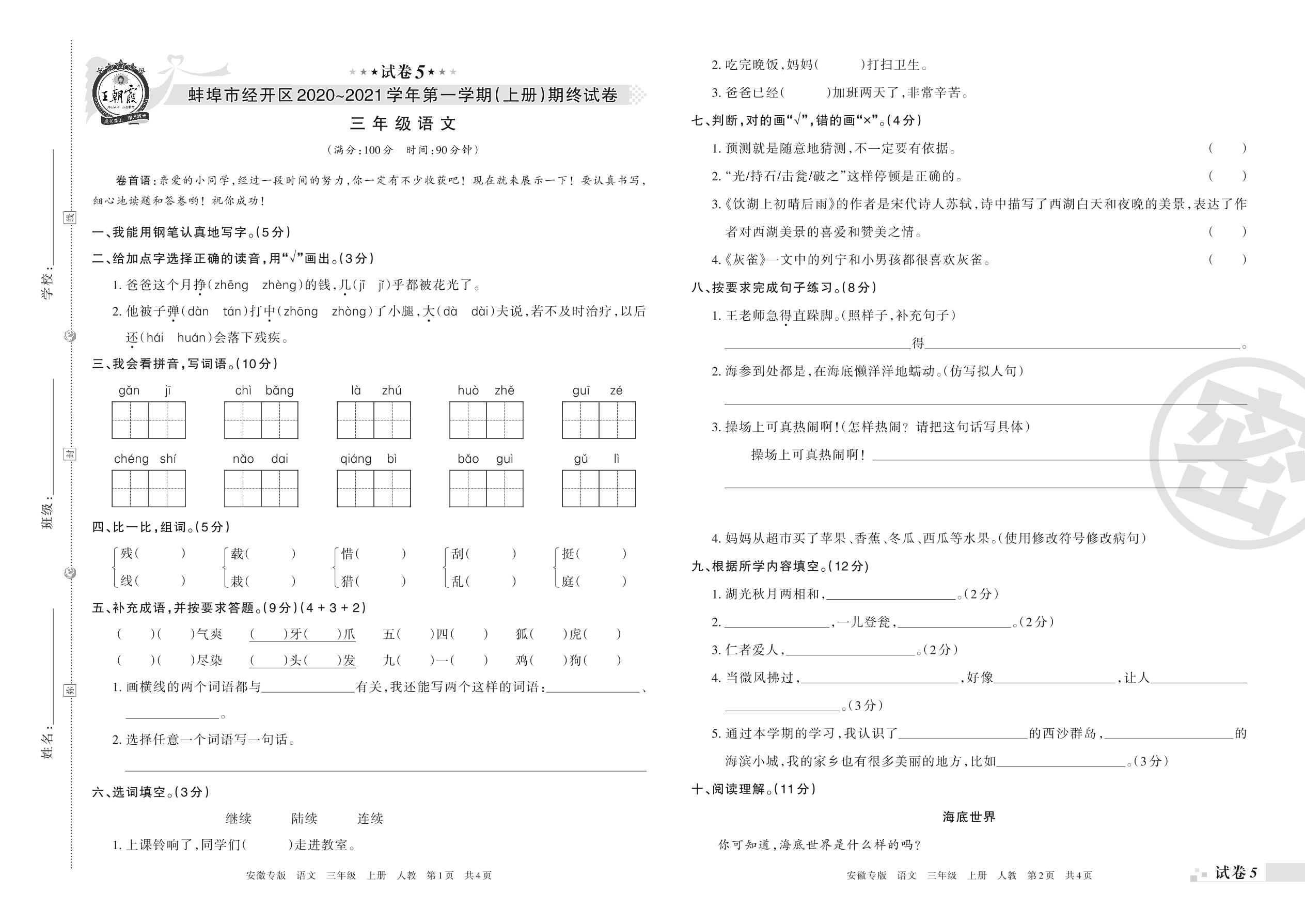 蚌埠市经开区2020~2021学年第一学期(上册)期终试卷三年级语文(人教版)【5】