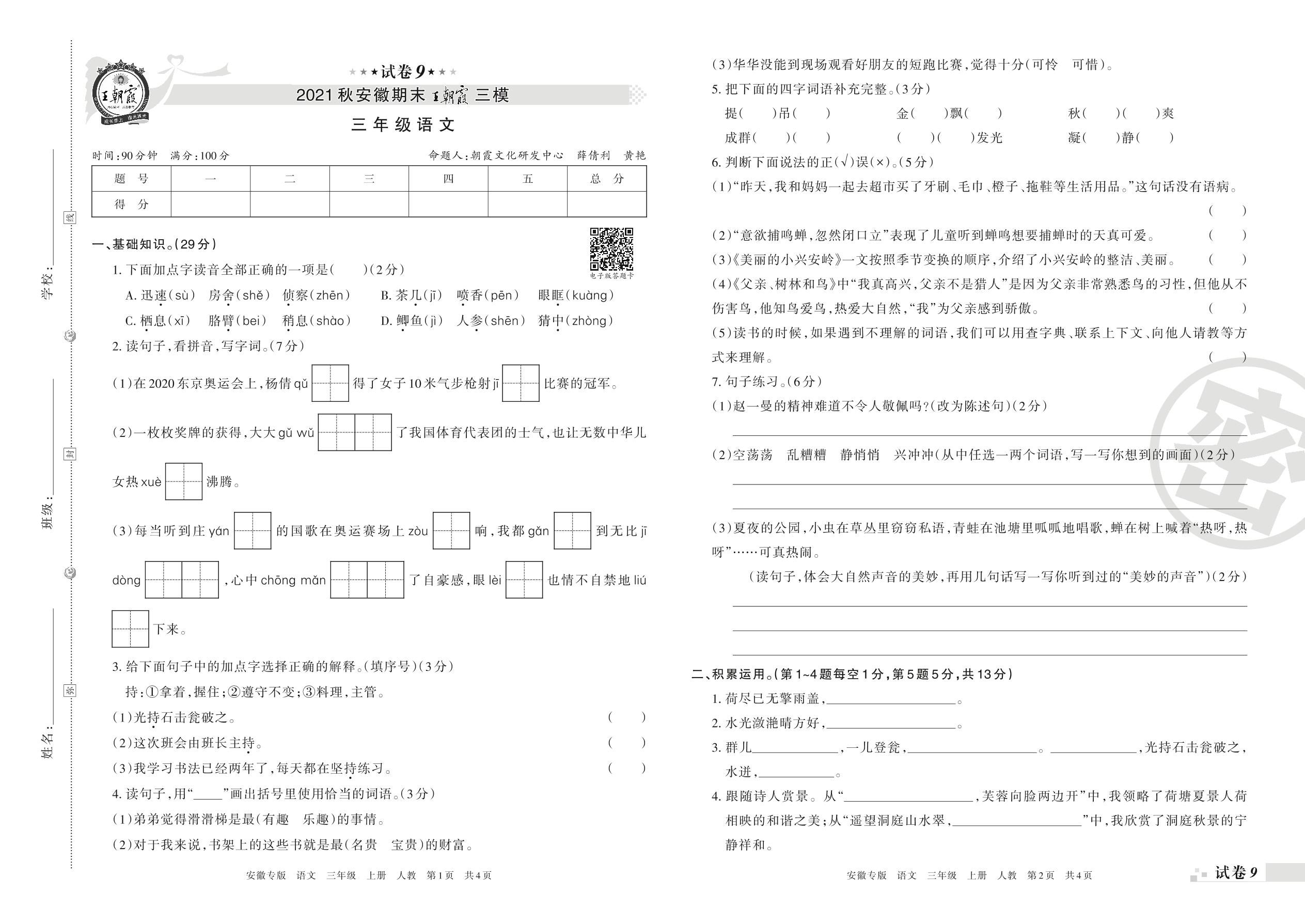 王朝霞期末模拟卷三年级上册语文(人教版)_R211223105156246【9】