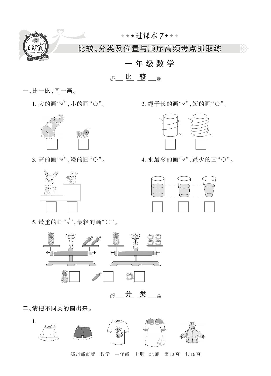 王朝霞期末过课本——比较、分类及位置与顺序高频考点抓取练一年级上册数学(北师版)_R211223105354070【7】