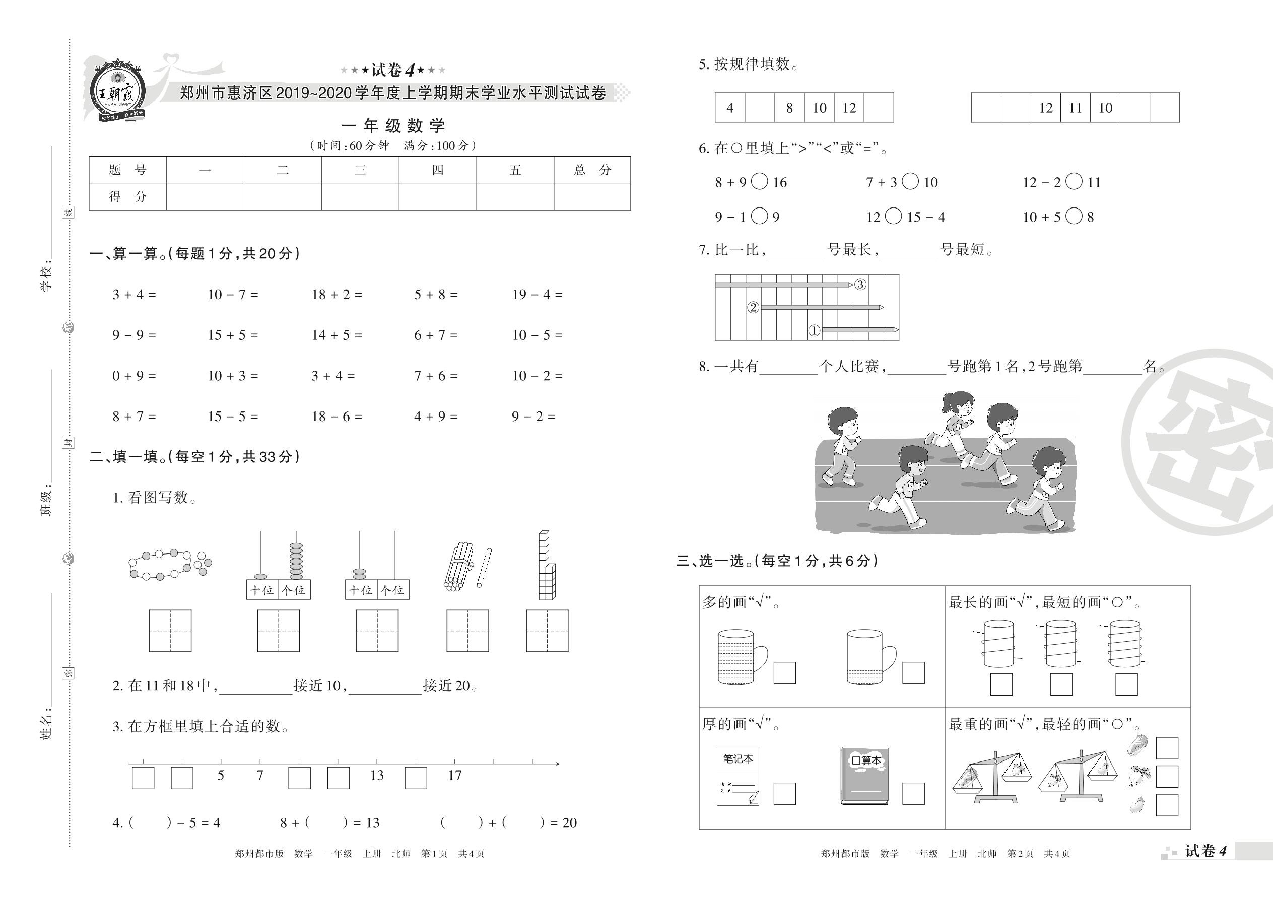 郑州市惠济区2019~2020学年度上学期期末学业水平测试试卷一年级数学(北师版)【4】
