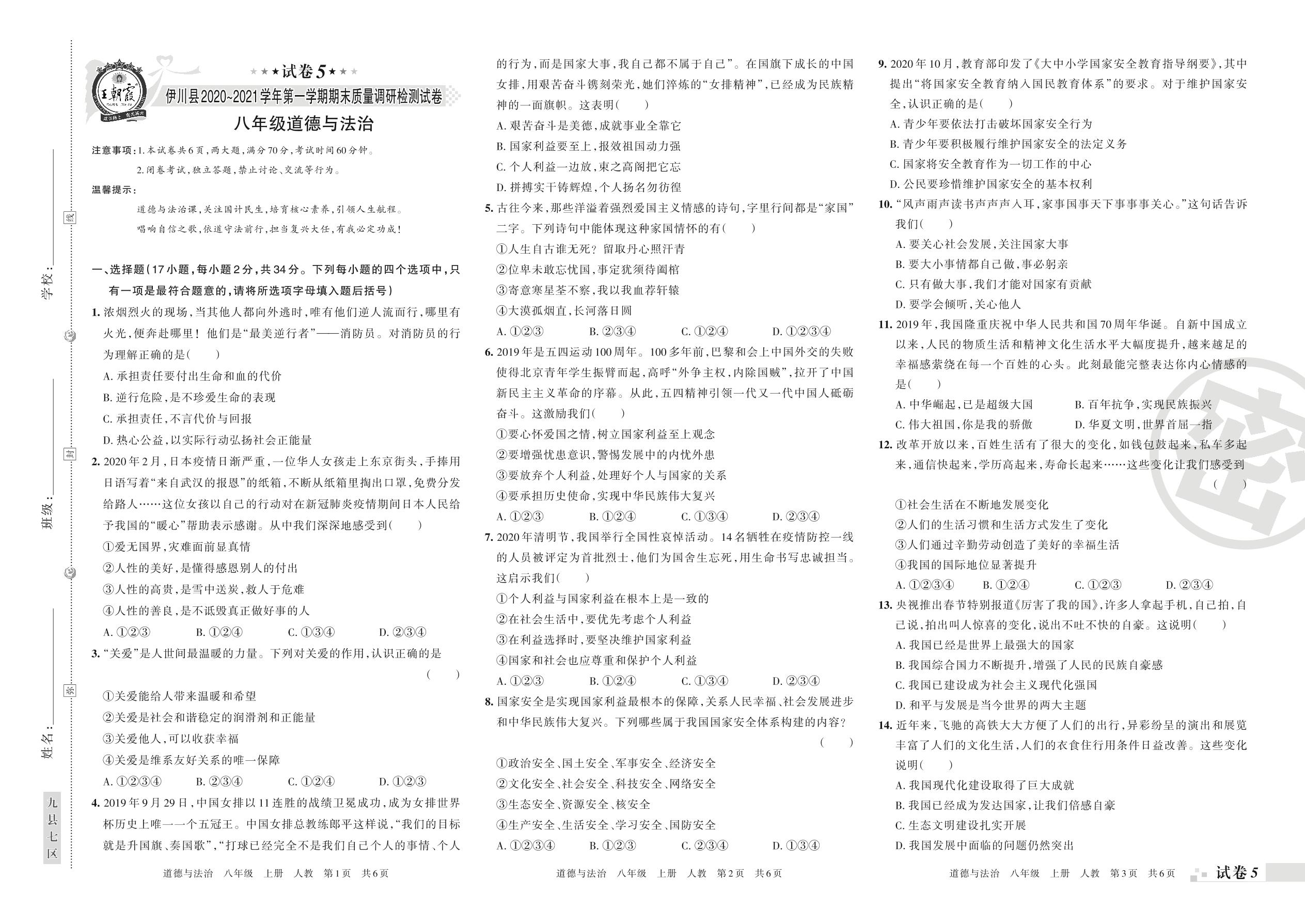 伊川县2020~2021学年第一学期期末质量调研检测试卷八年级道德与法治(人教版)【5】