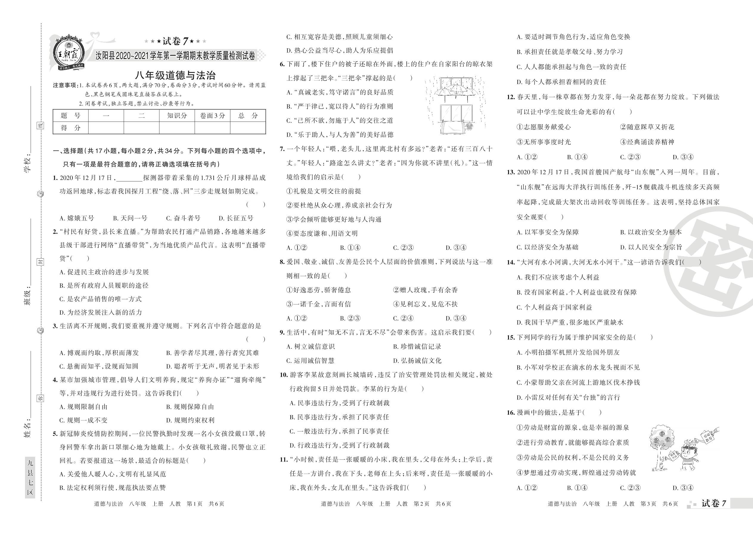 汝阳县2020~2021学年第一学期期末教学质量检测试卷八年级道德与法治(人教版)【7】