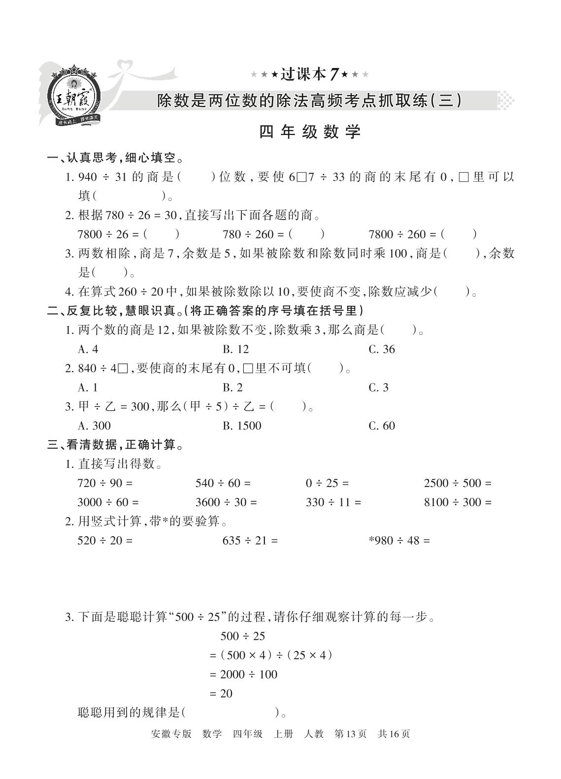 王朝霞期末过课本——除数是两位数的除法高频考点抓取练(三)四年级上册数学(人教版)【7】