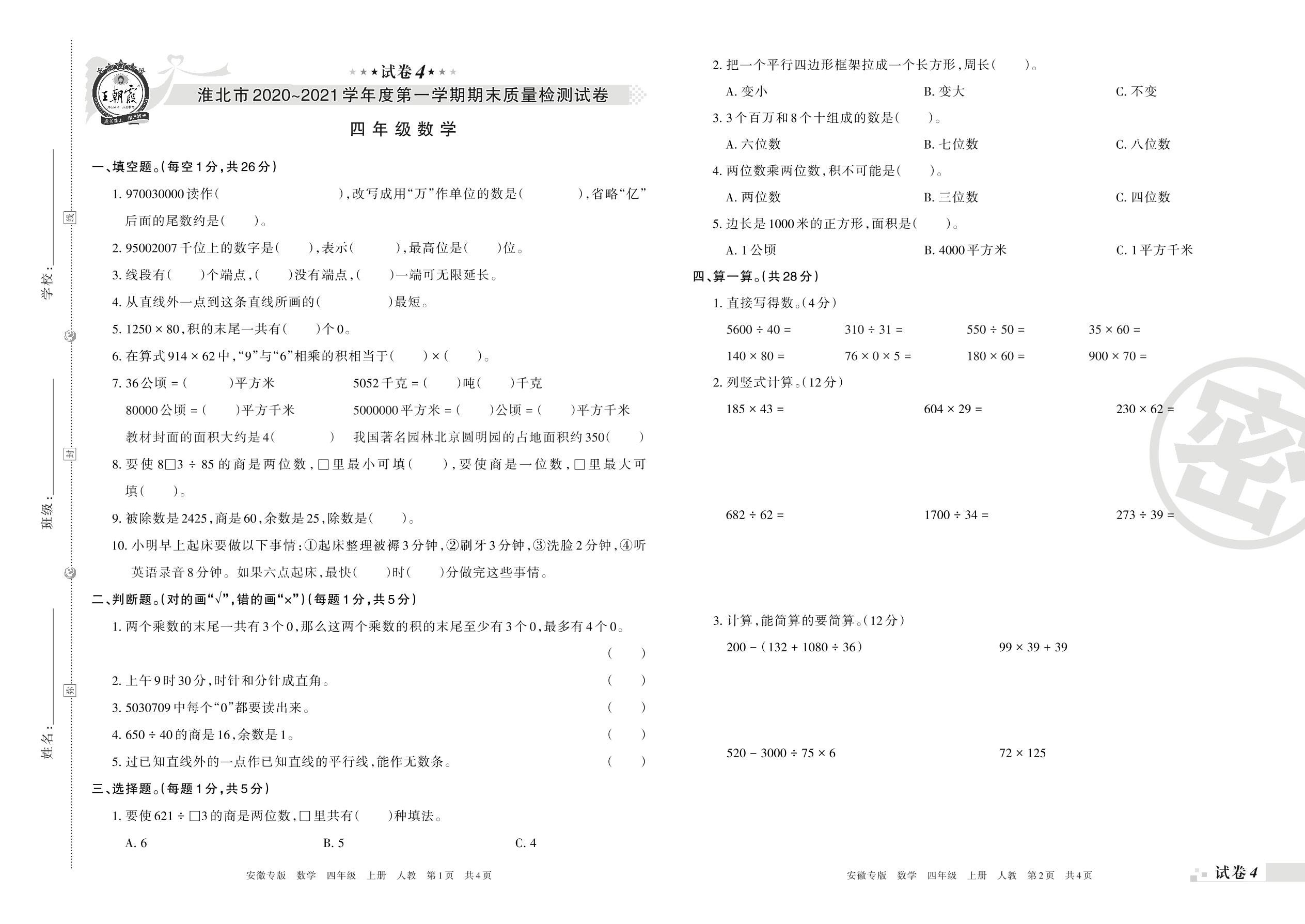 淮北市2020~2021学年度第一学期期末质量检测试卷四年级数学(人教版)【4】