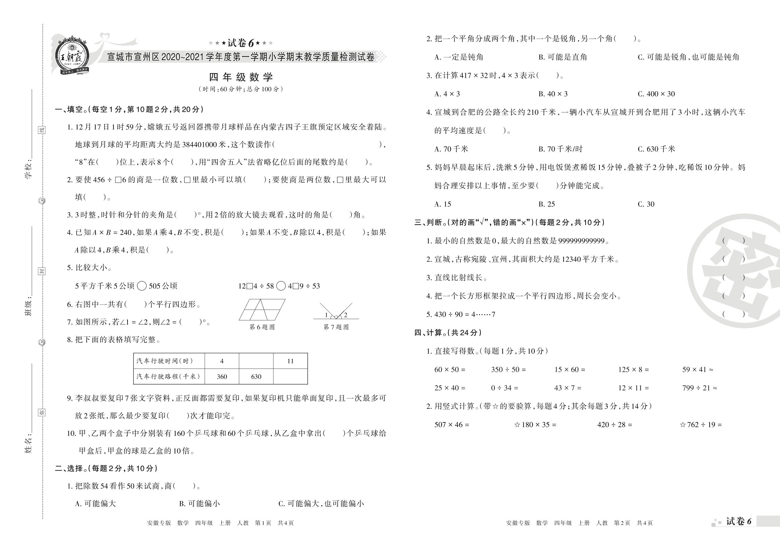 宣城市宣州区2020~2021学年度第一学期小学期末教学质量检测试卷四年级数学(人教版)【6】