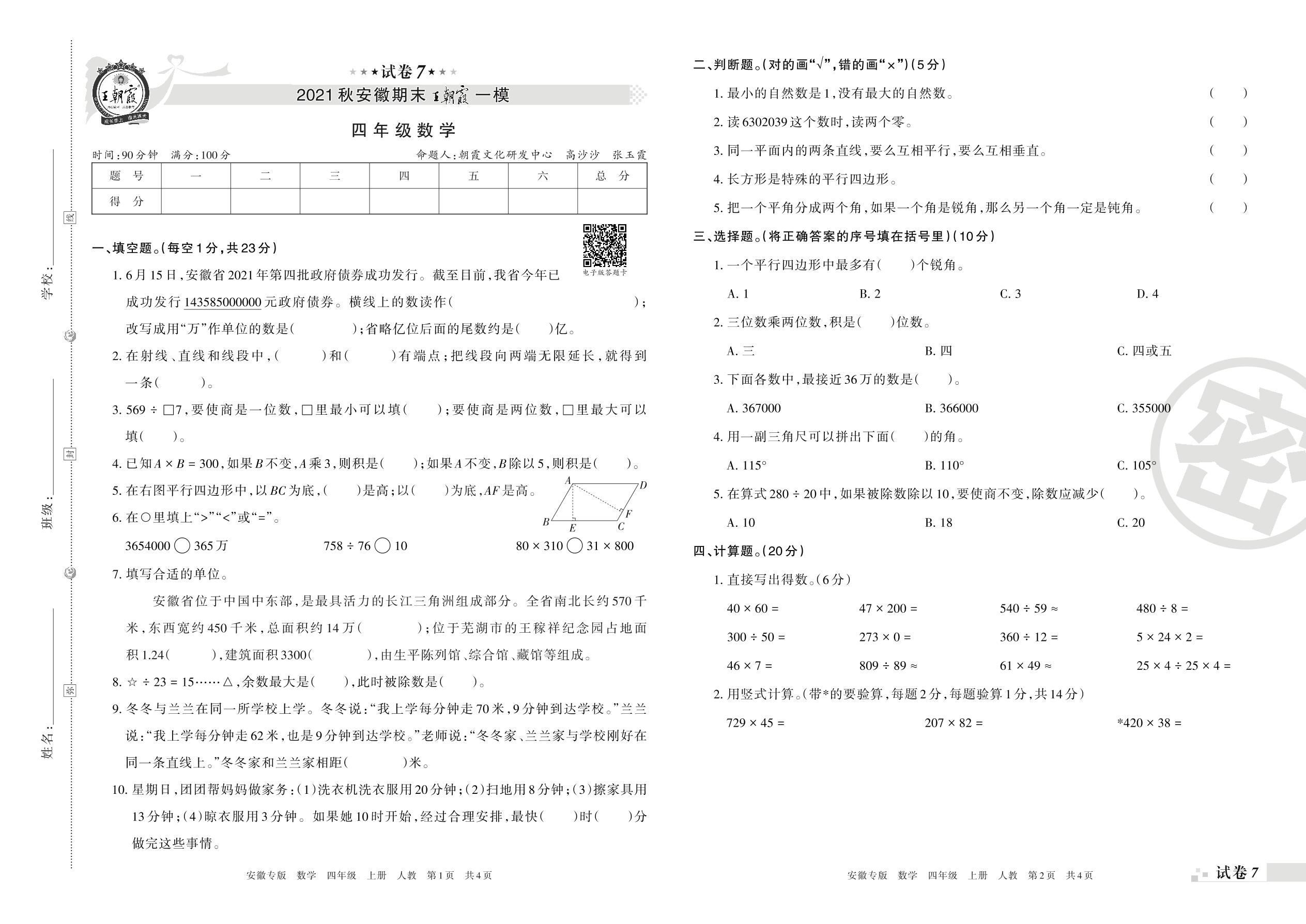 王朝霞期末模拟卷四年级上册数学(人教版)【7】