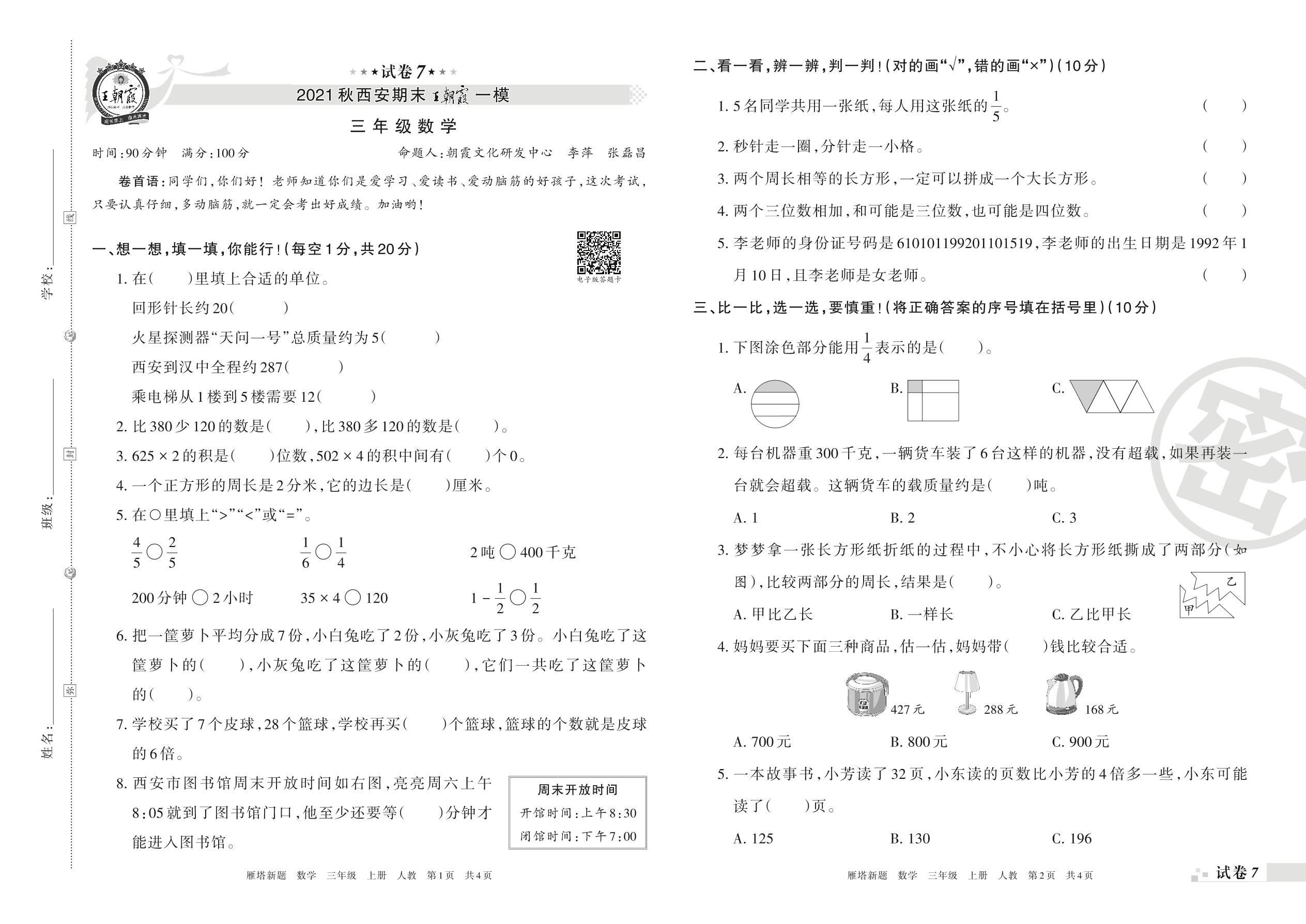 王朝霞期末模拟卷三年级上册数学(人教版)_R211223110205224【7】