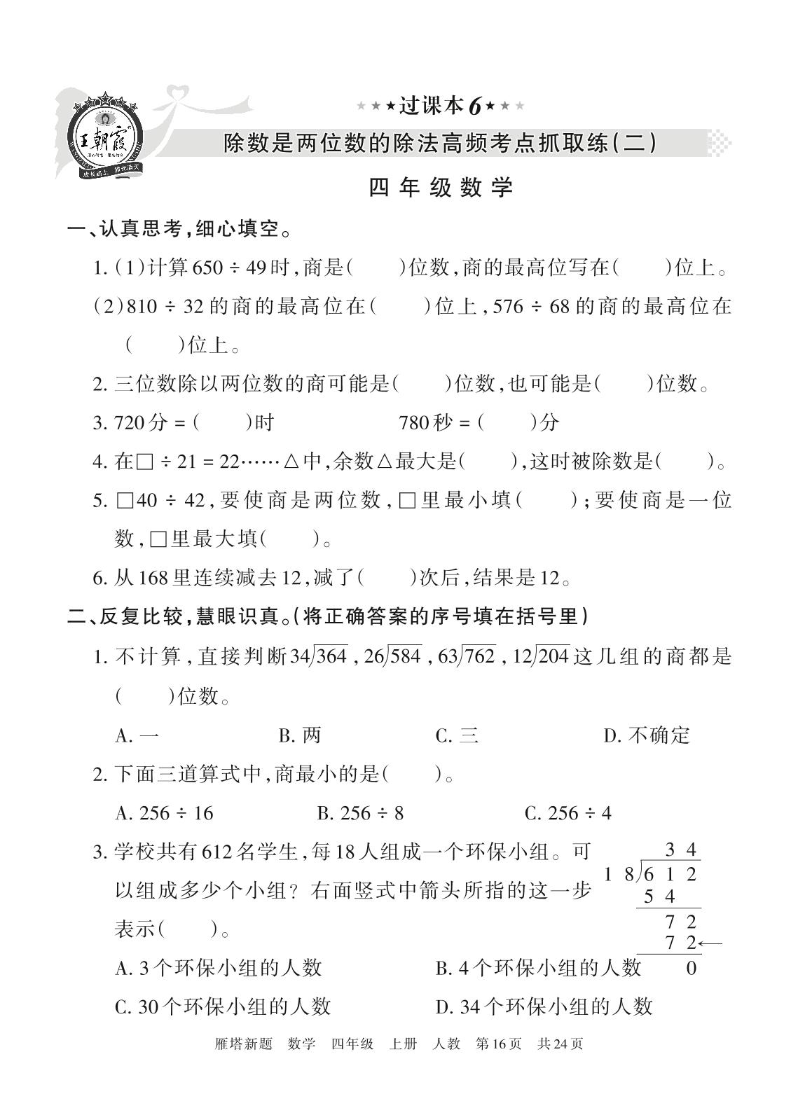 王朝霞期末过课本——除数是两位数的除法高频考点抓取练(二)四年级上册数学(人教版)_R211223110538543【6】