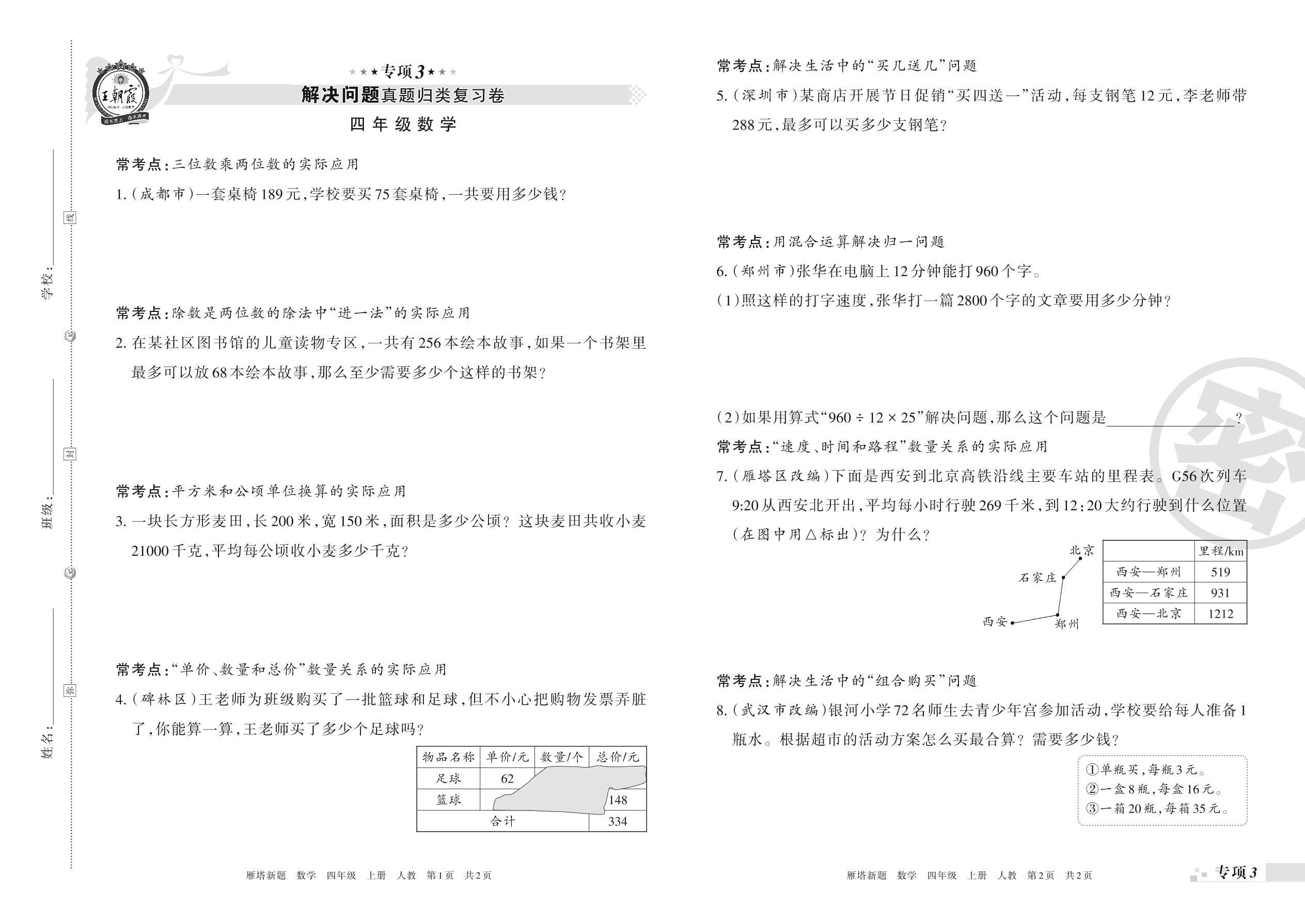 王朝霞期末专项卷——解决问题真题归类复习卷四年级上册数学(人教版)【3】