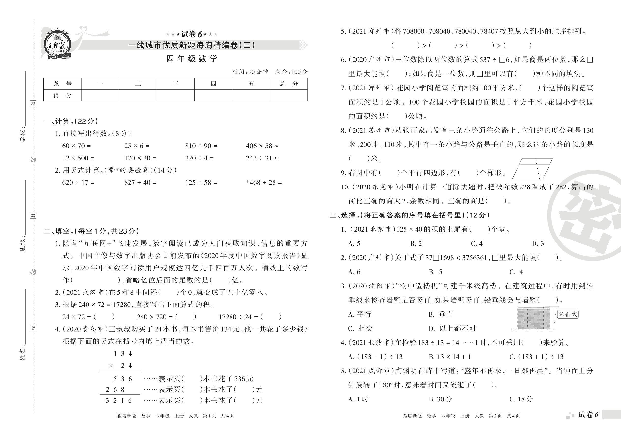 一线城市优质新题海淘精编卷(三)四年级上册数学(人教版)【6】
