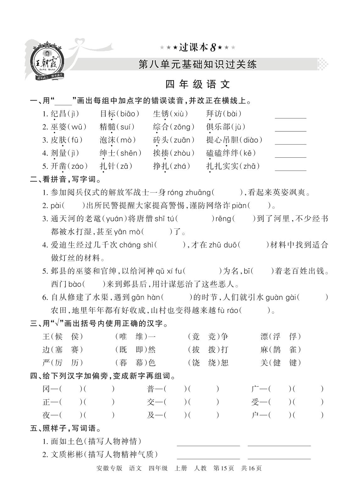 王朝霞期末过课本——第八单元基础知识过关练四年级上册语文(人教版)【8】
