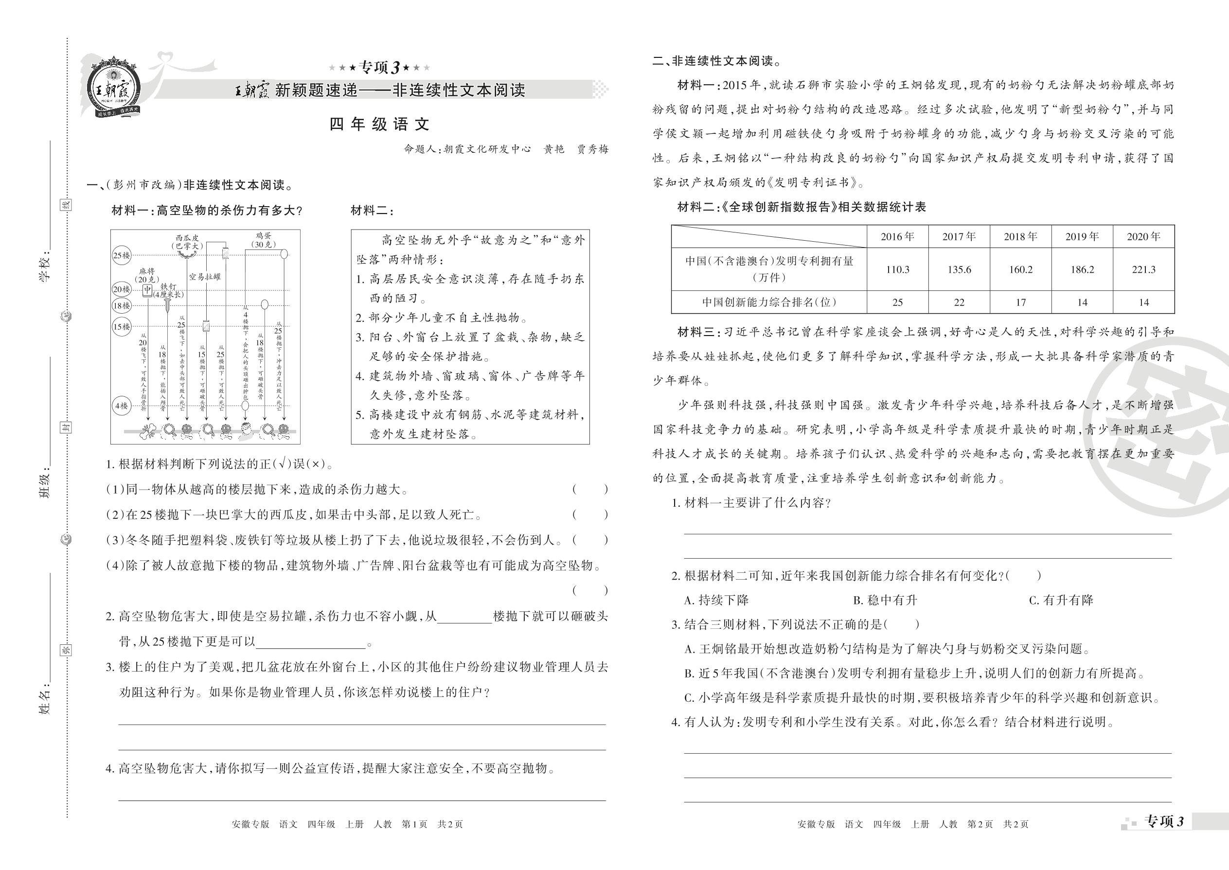 王朝霞期末专项卷——新颖题速递:非连续性文本阅读四年级上册语文(人教版)【3】