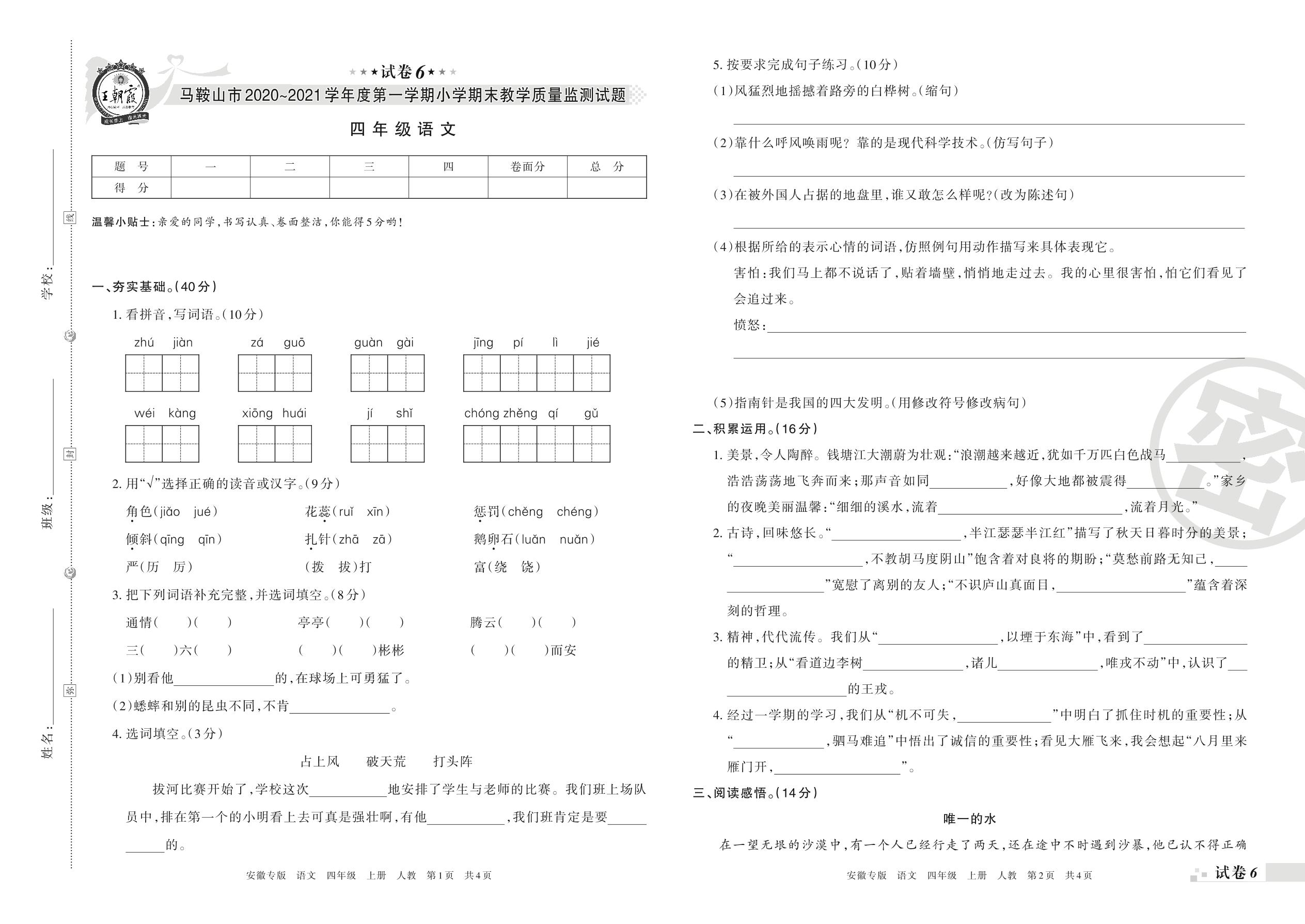 马鞍山市2020~2021学年度第一学期小学期末教学质量监测试题四年级语文(人教版)【6】