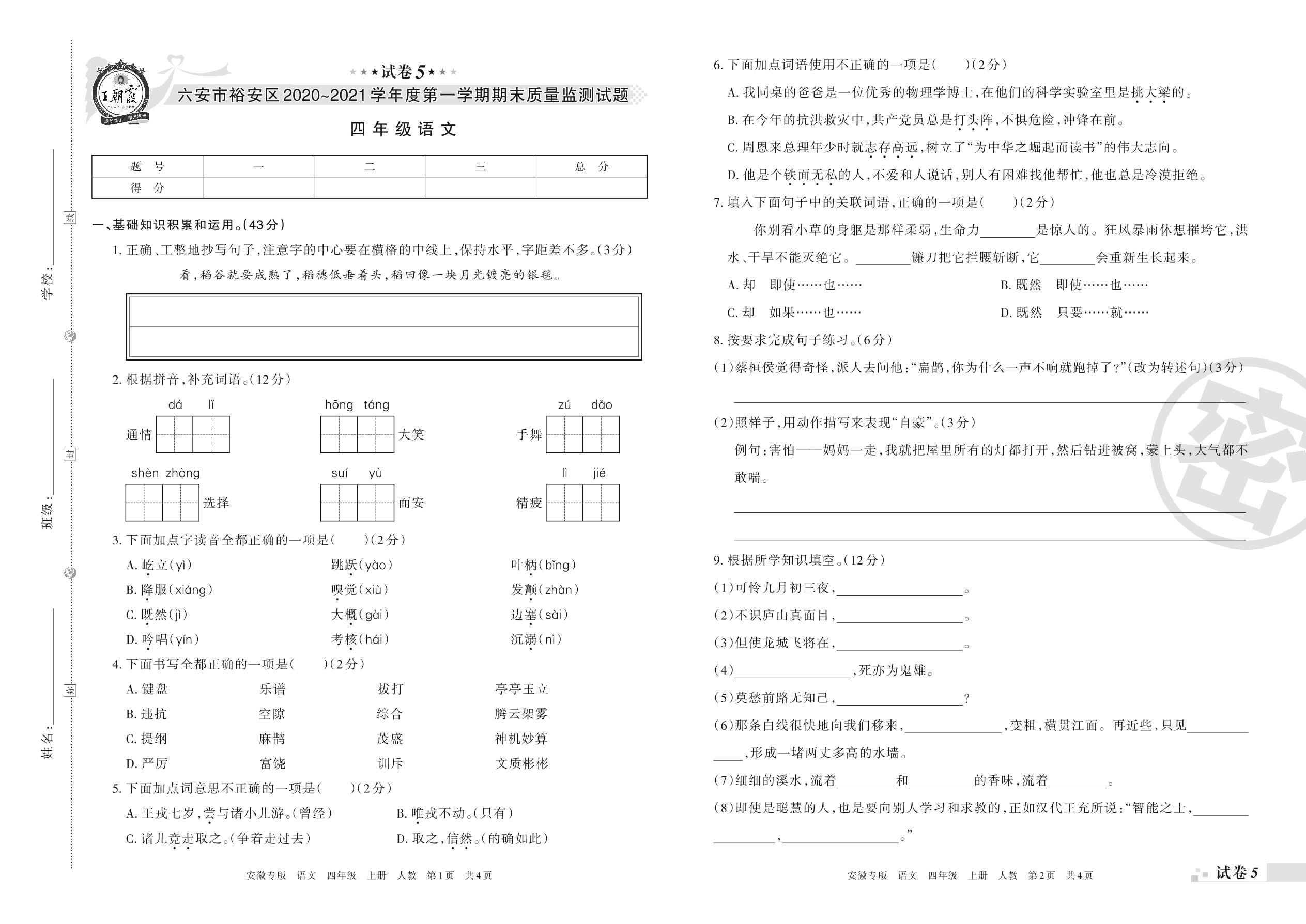 六安市裕安区2020~2021学年度第一学期期末质量监测试题四年级语文(人教版)【5】