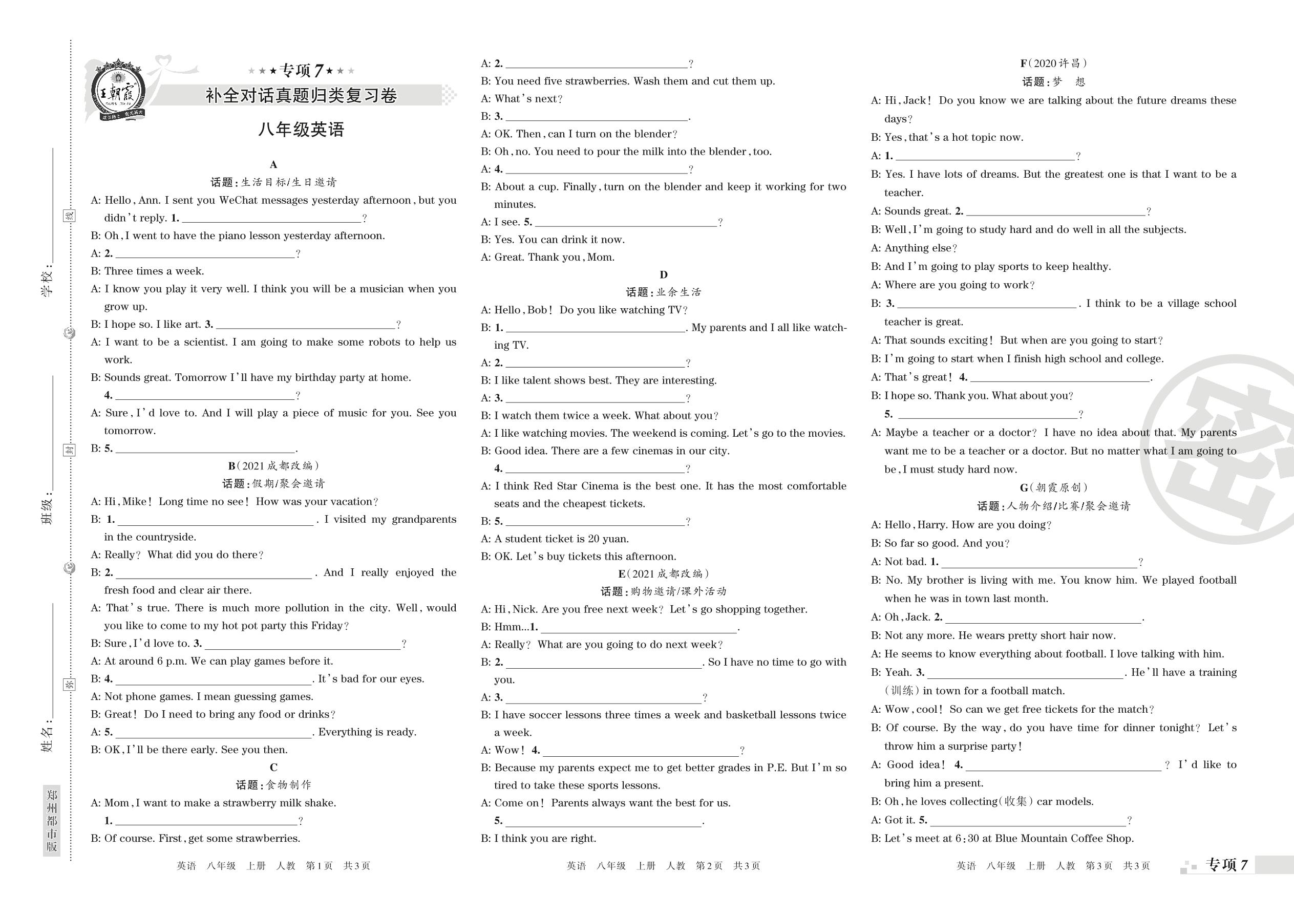 王朝霞期末专项卷——补全对话真题归类复习卷八年级上册英语(人教版)【7】
