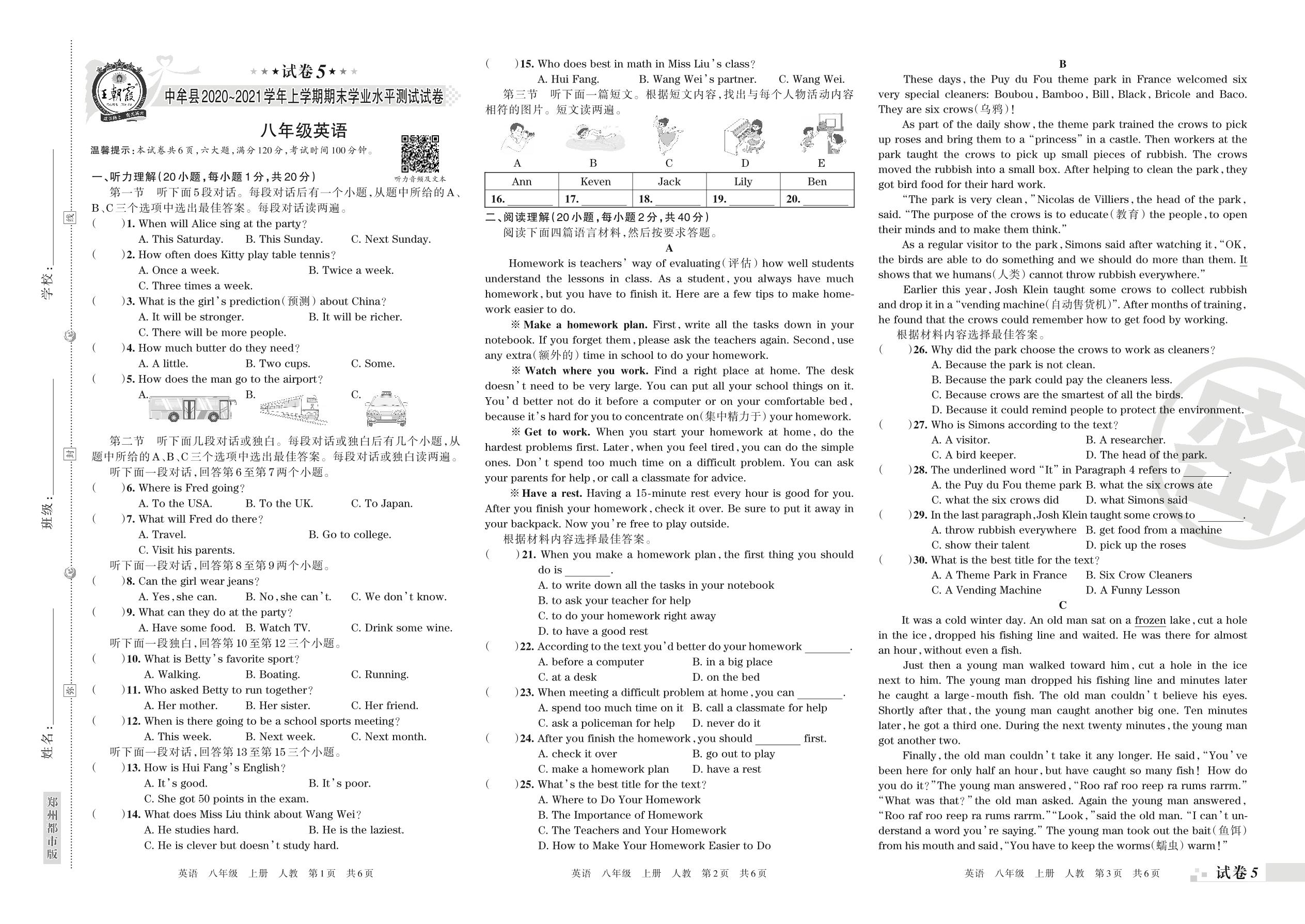 中牟县2020~2021学年上学期期末学业水平测试试卷八年级英语(人教版)【5】