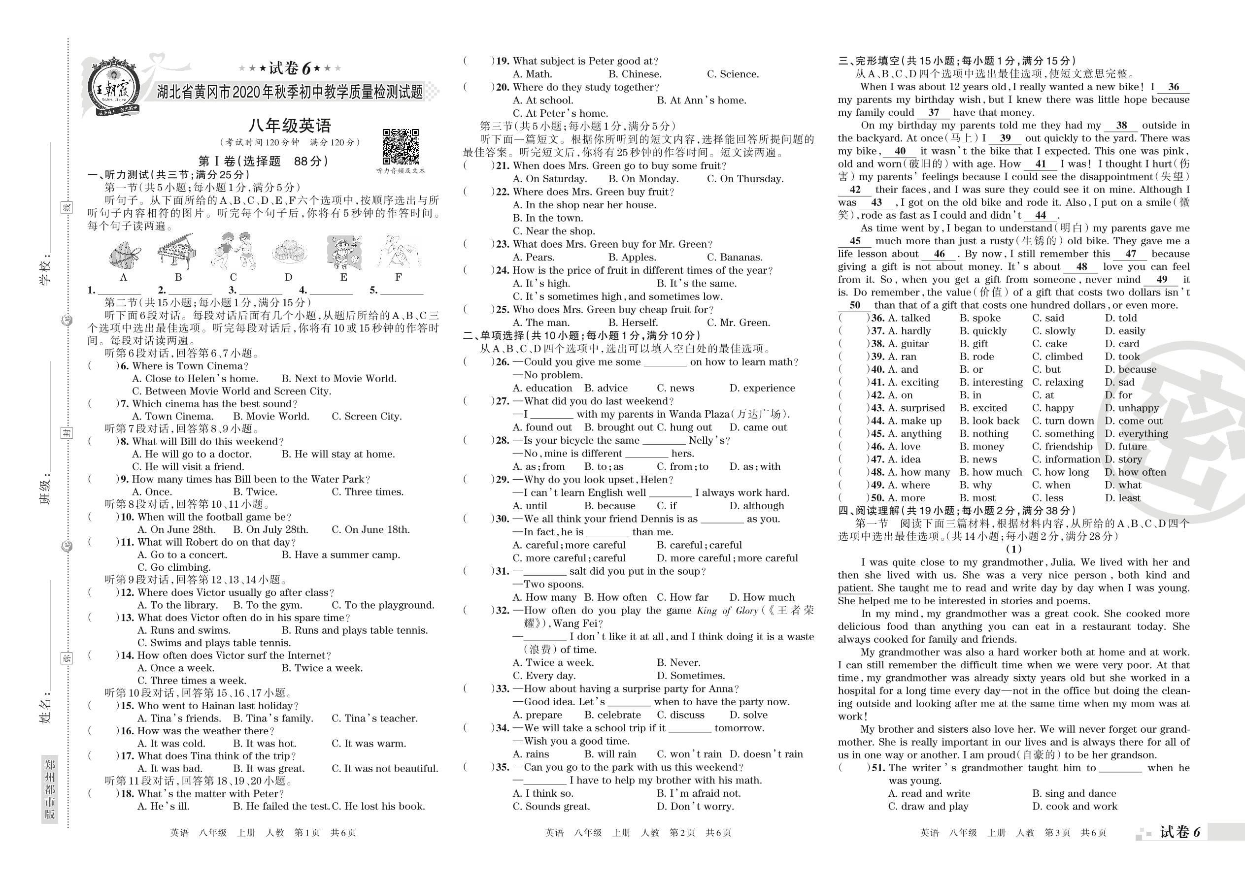 湖北省黄冈市2020年秋季初中教学质量检测试题八年级英语(人教版)【6】