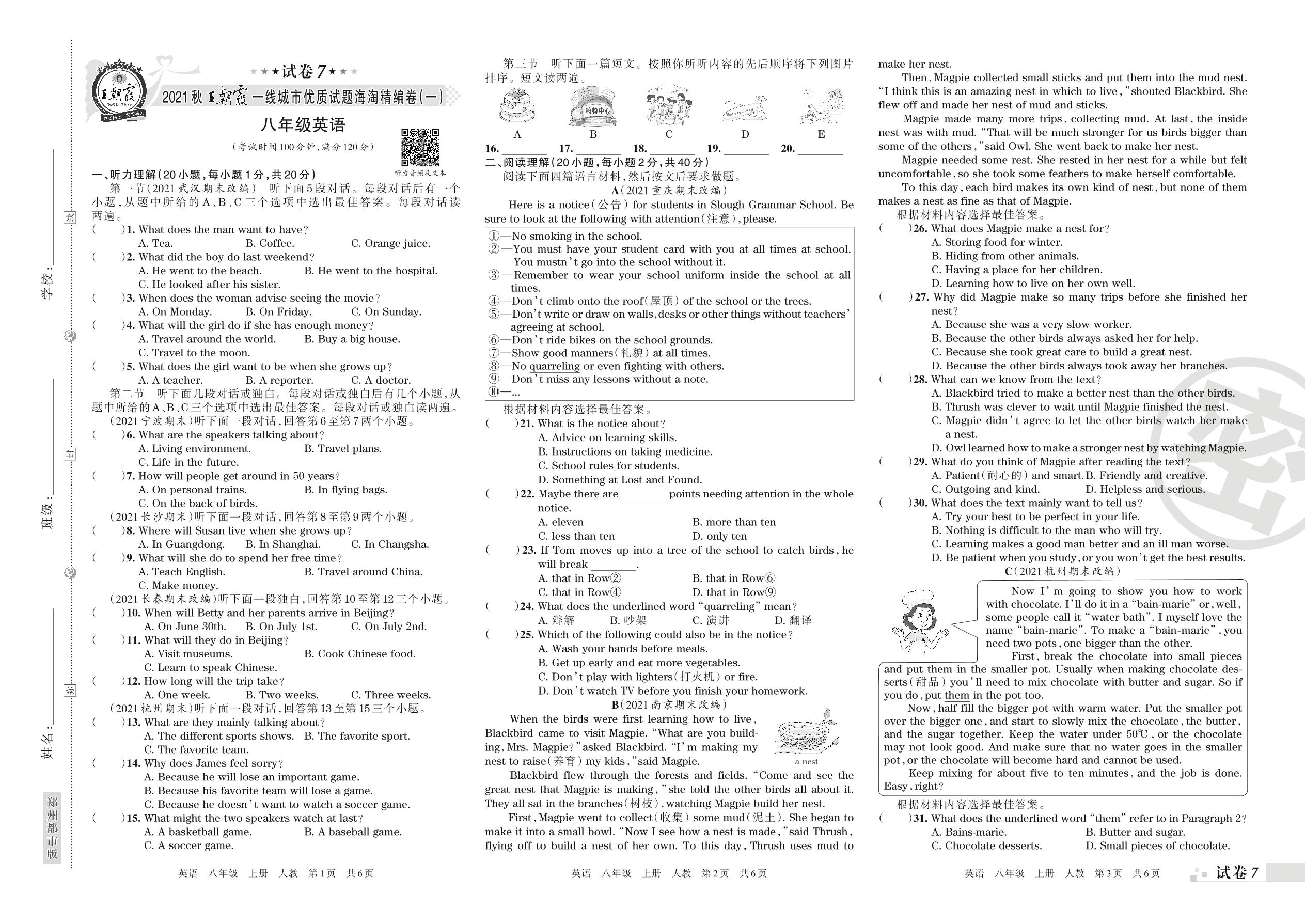 一线城市优质试题海淘精编卷(一)八年级上册英语(人教版)【7】