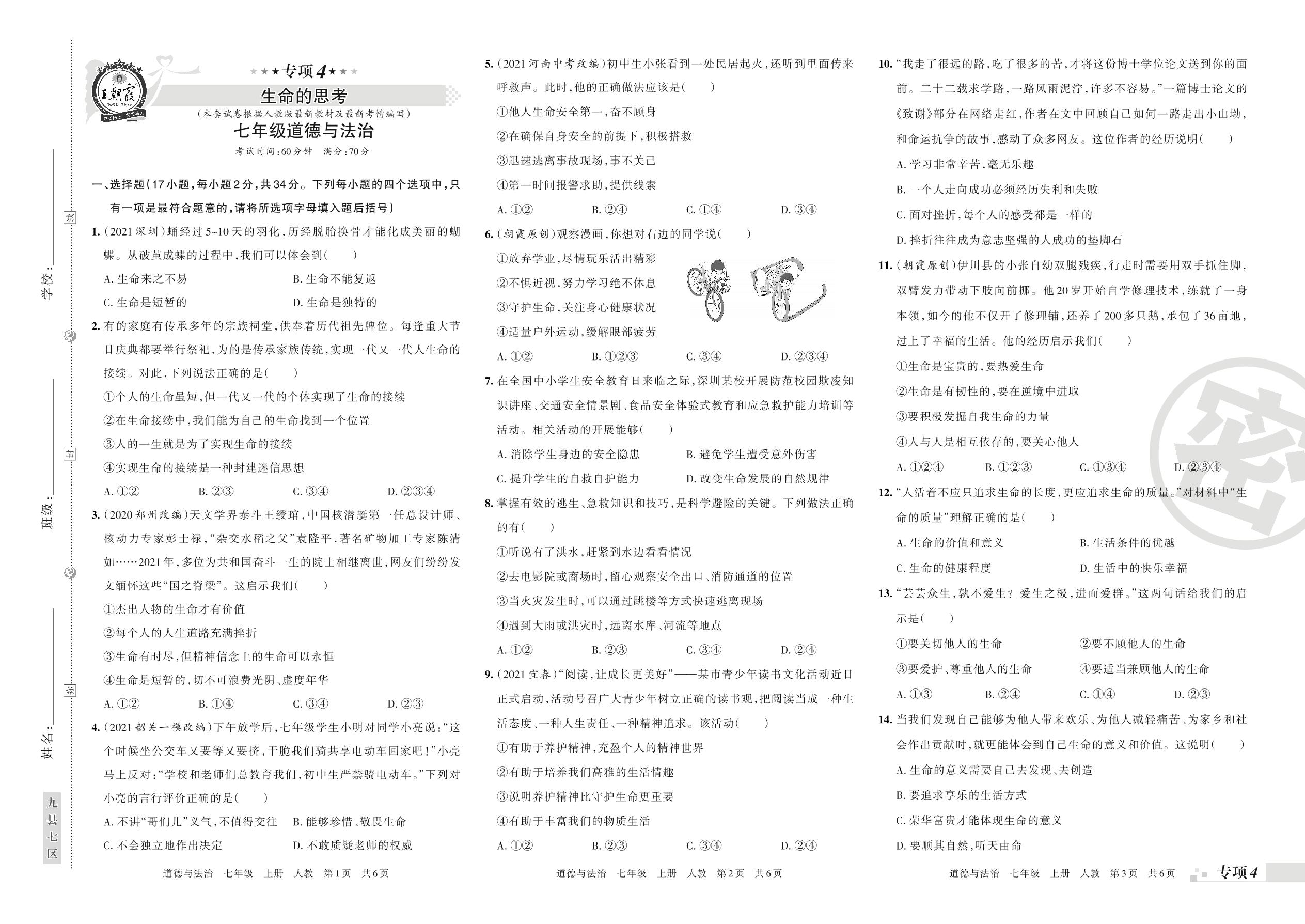 王朝霞期末专项卷——生命的思考七年级上册道德与法治(人教版)【4】