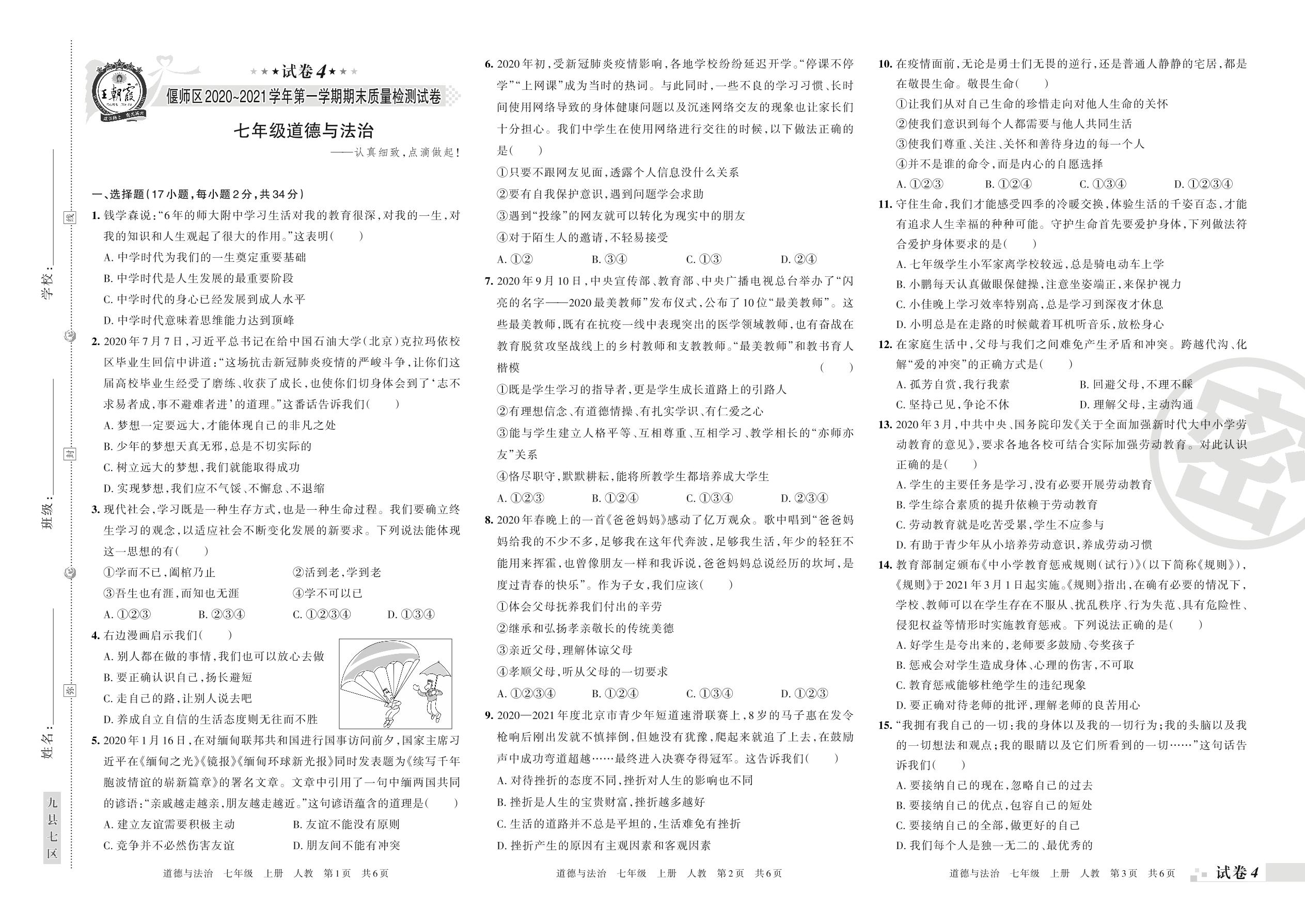 偃师区2020~2021学年第一学期期末质量检测试卷七年级道德与法治(人教版)【4】