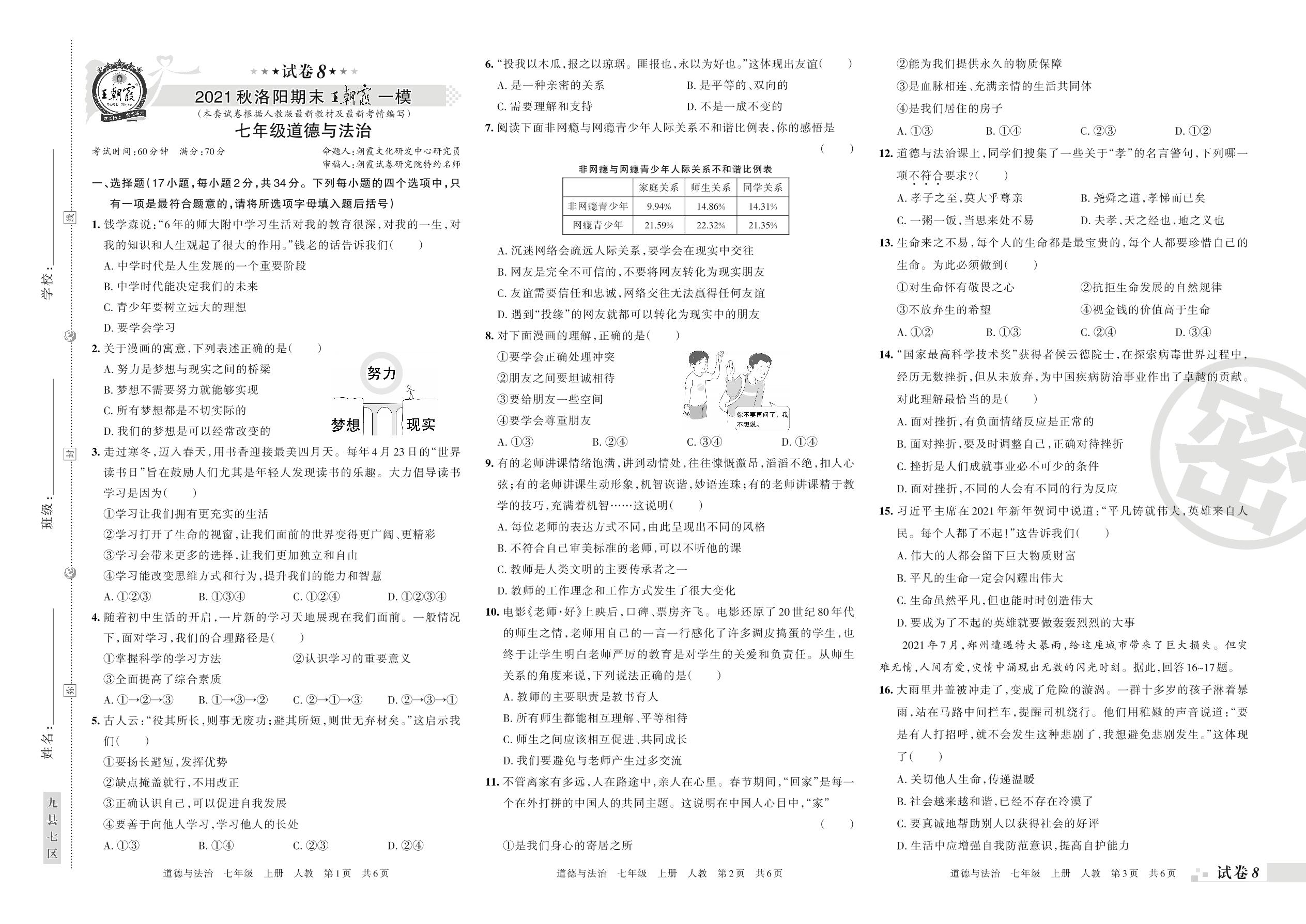 王朝霞期末模拟卷七年级上册道德与法治(人教版)【8】