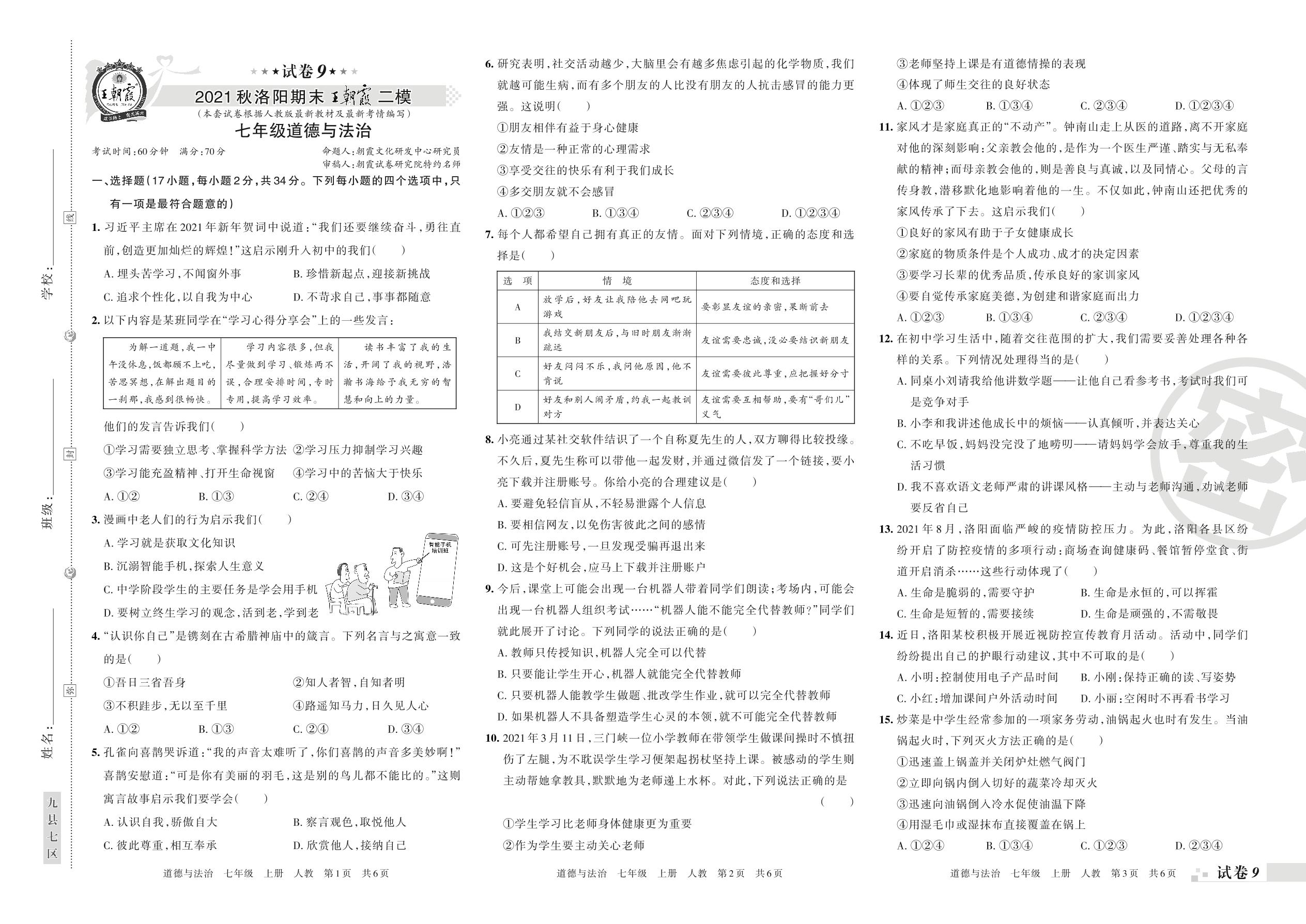 王朝霞期末模拟卷七年级上册道德与法治(人教版)【9】