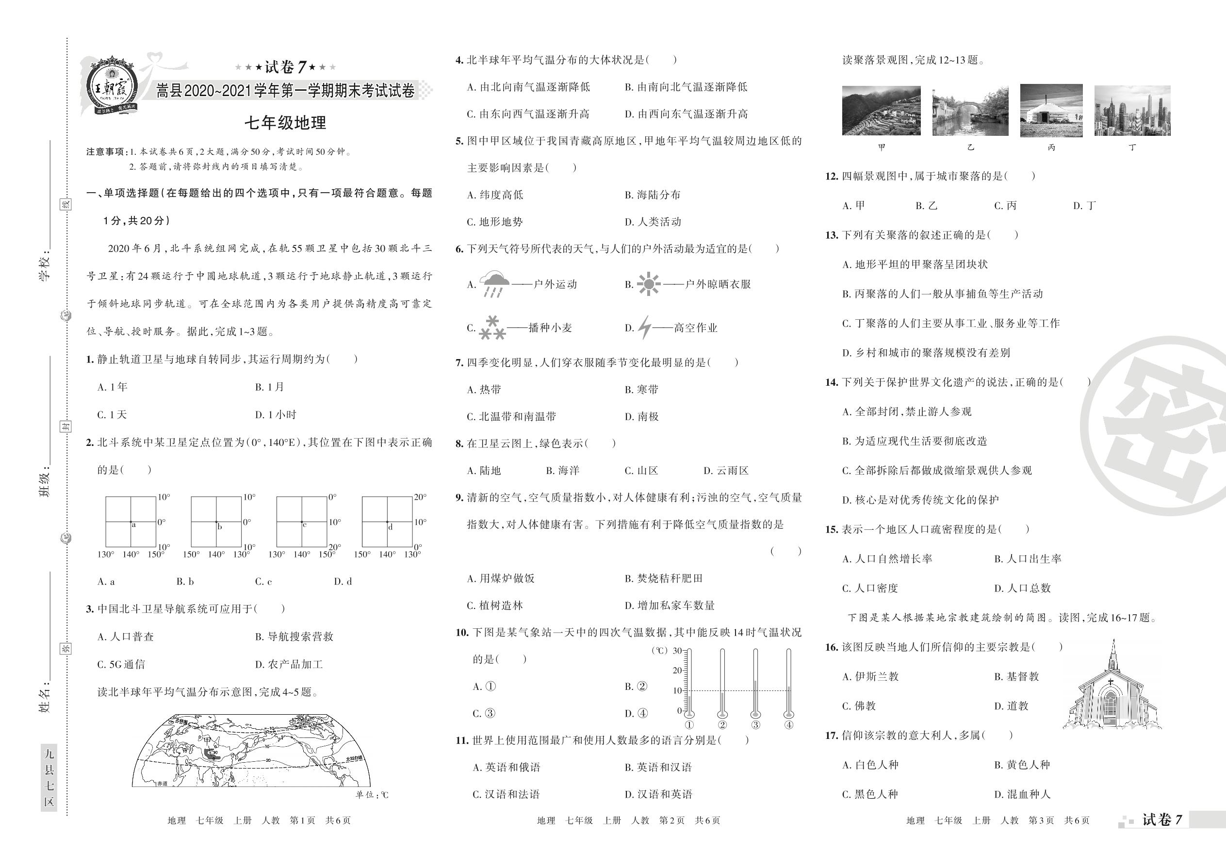 嵩县2020~2021学年第一学期期末考试试卷七年级地理(人教版)【7】
