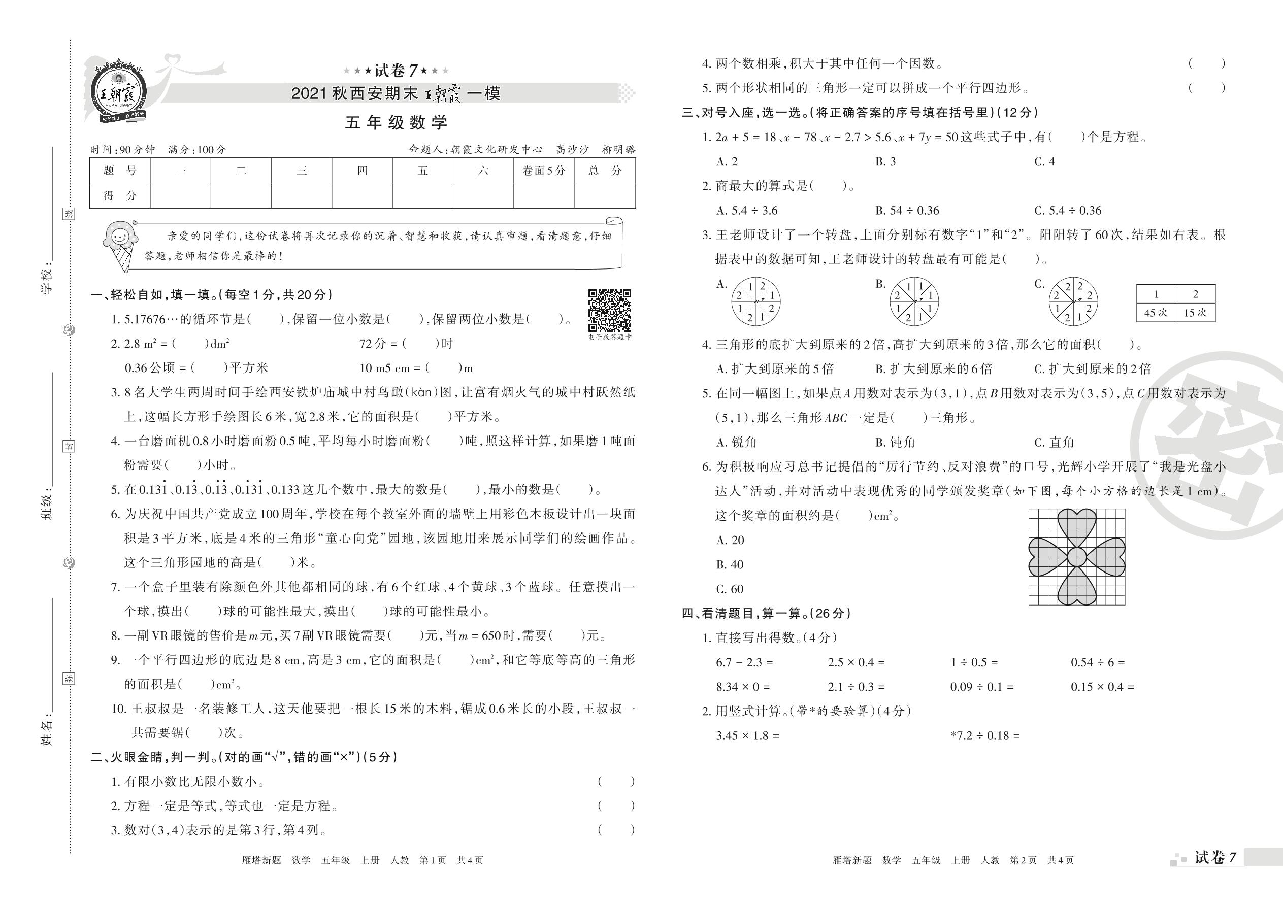 王朝霞期末模拟卷五年级上册数学(人教版)【7】