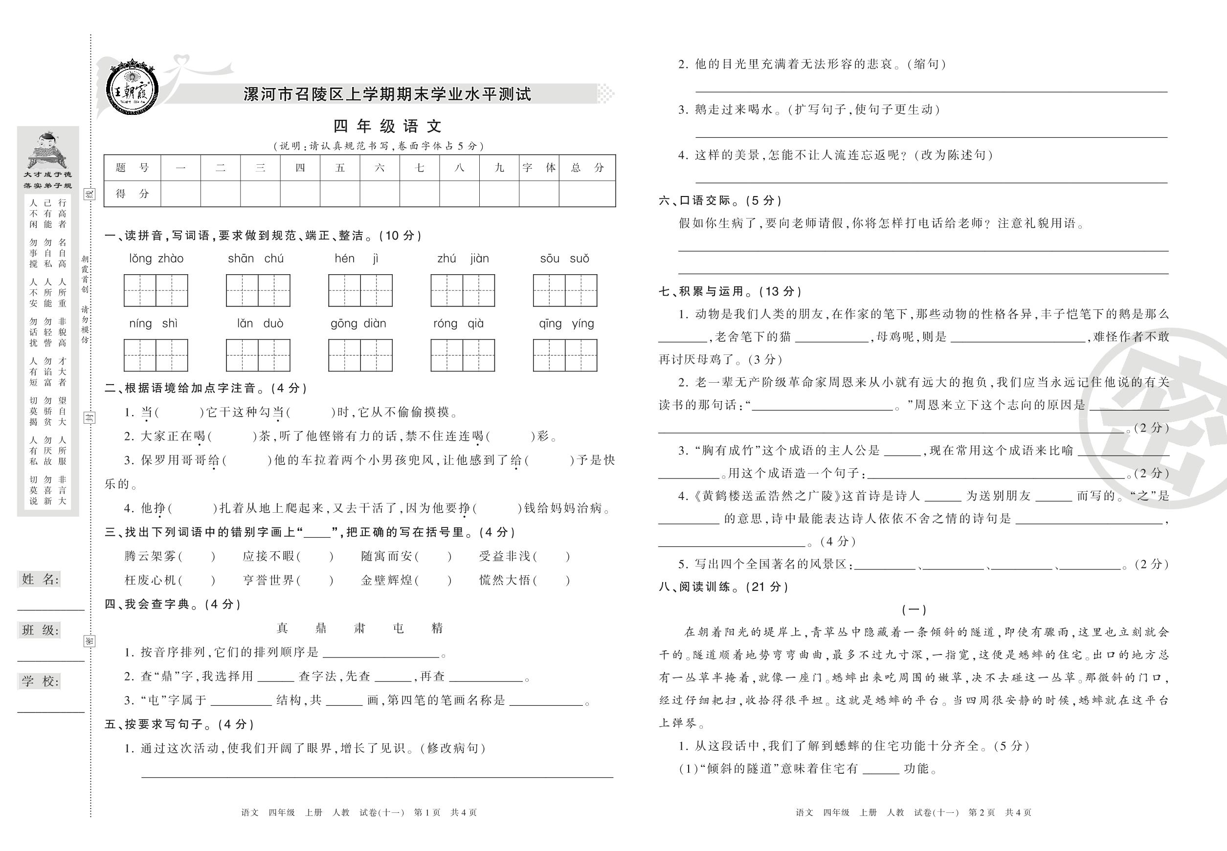 2016-2017学年第一学期漯河市召陵区四年级语文试卷(人教版)【11】
