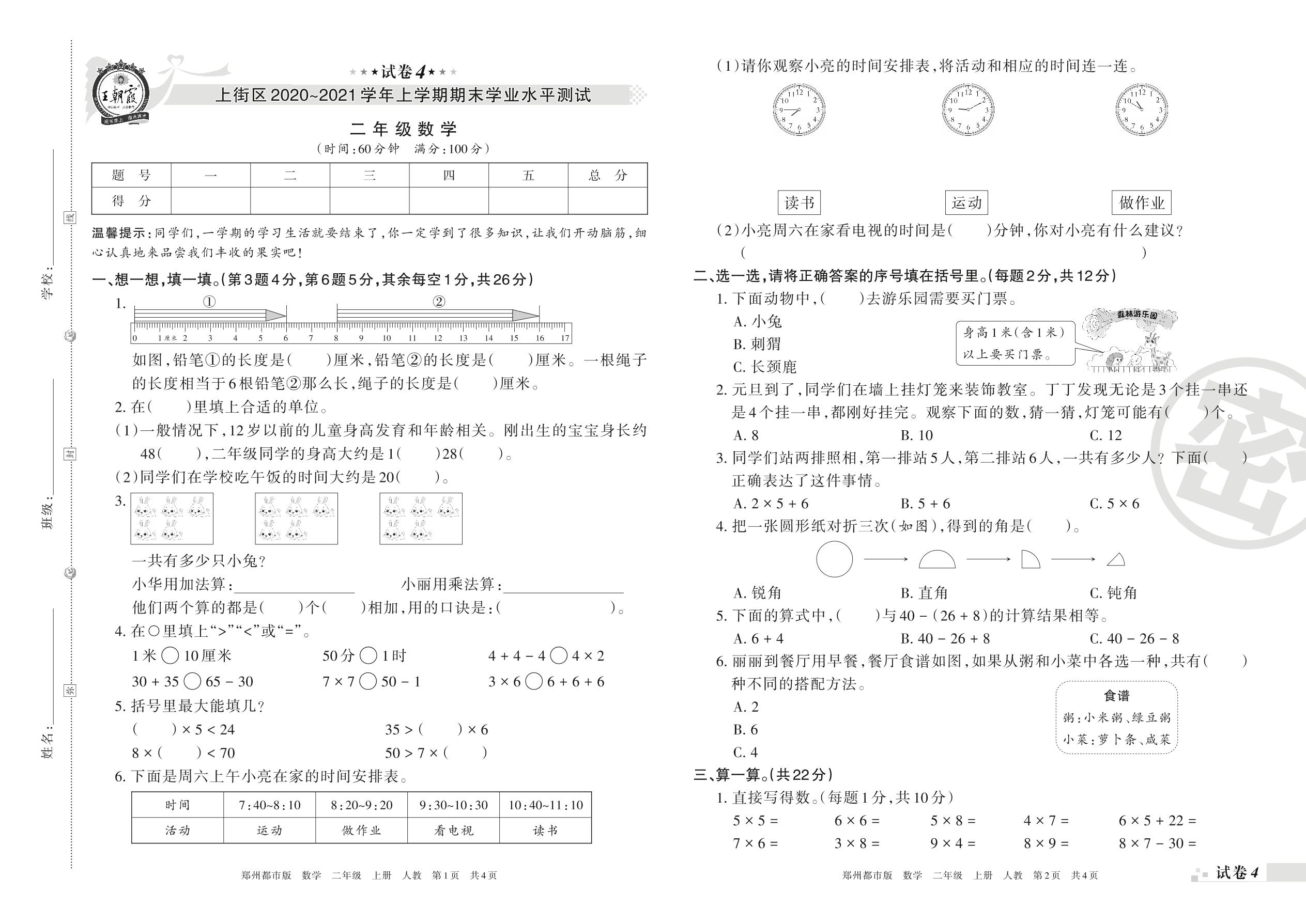 上街区2020~2021学年上学期期末学业水平测试二年级数学(人教版)【4】