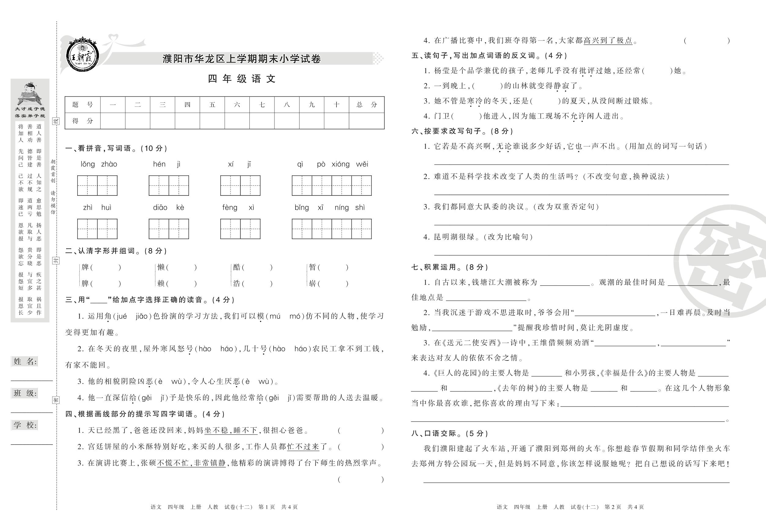 2016-2017学年第一学期濮阳市华龙区四年级语文试卷(人教版)【12】
