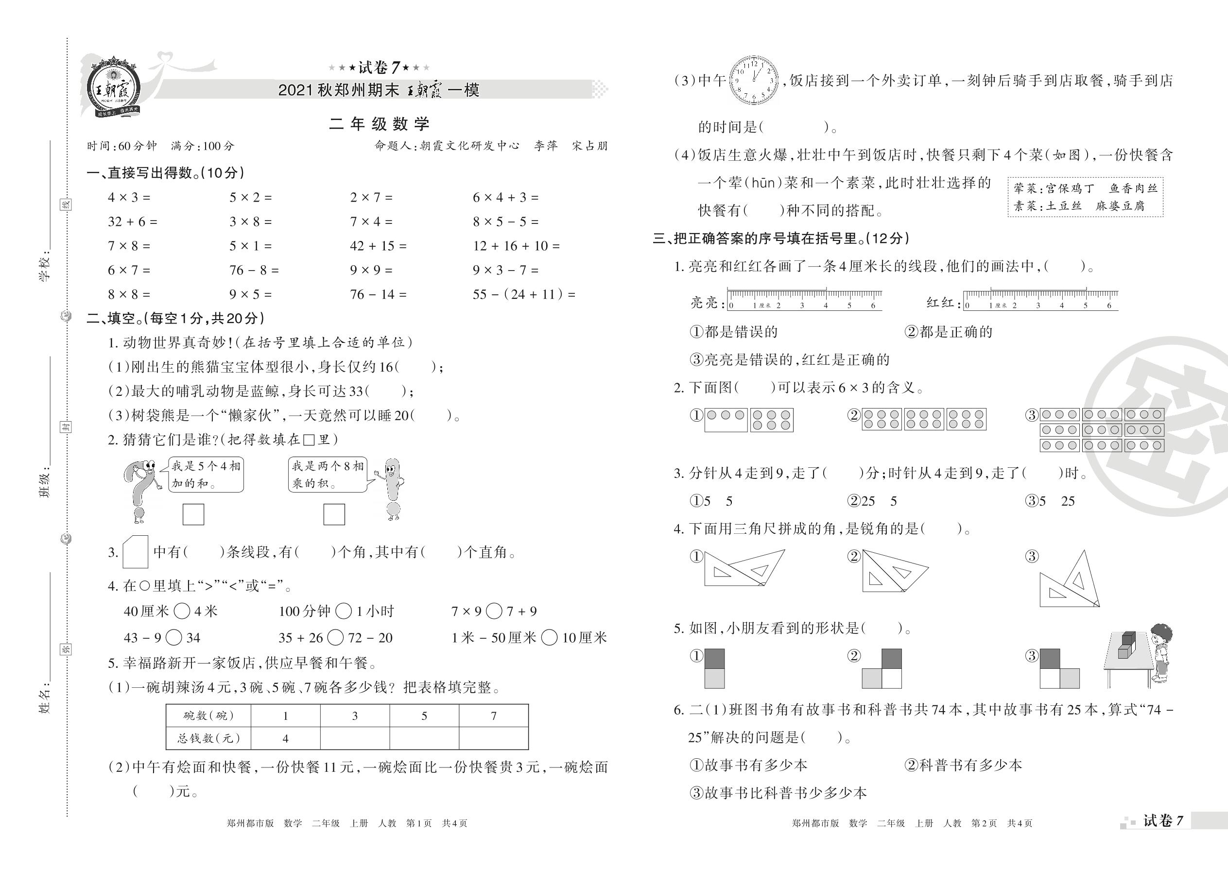 王朝霞期末模拟卷二年级上册数学(人教版)_R211223112108893【7】