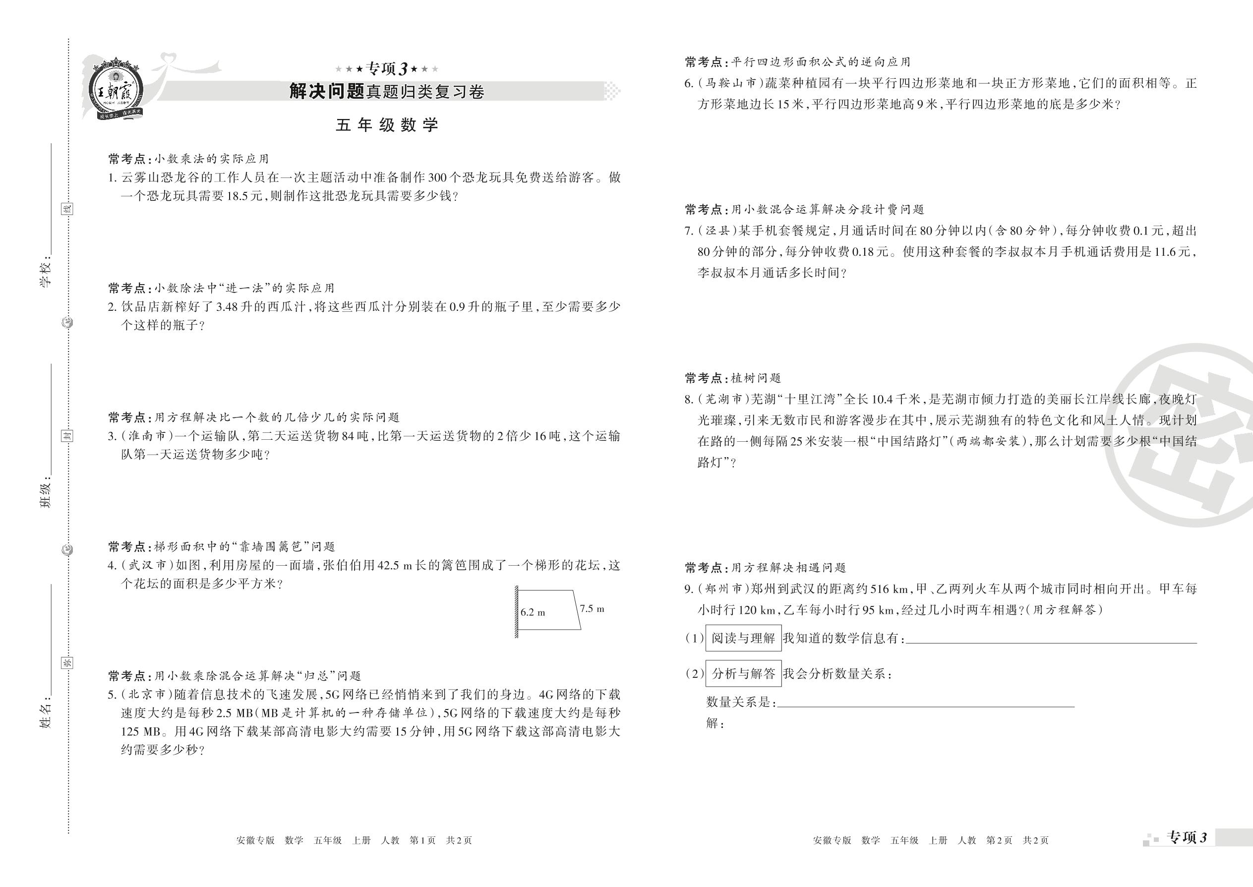 王朝霞期末专项卷——解决问题真题归类复习五年级上册数学(人教版)【3】