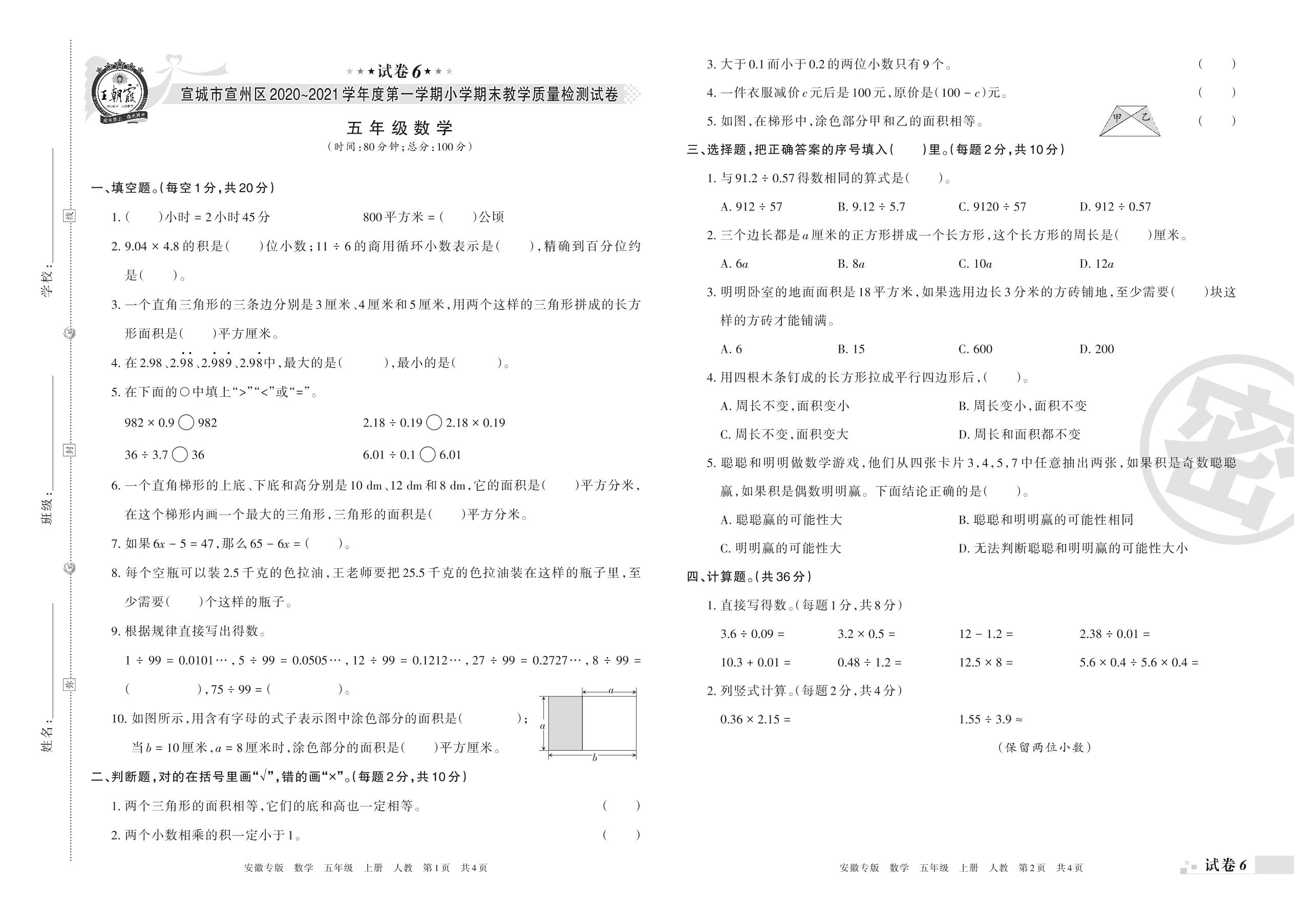 宣城市宣州区2020~2021学年度第一学期小学期末教学质量检测试卷五年级数学(人教版)【6】