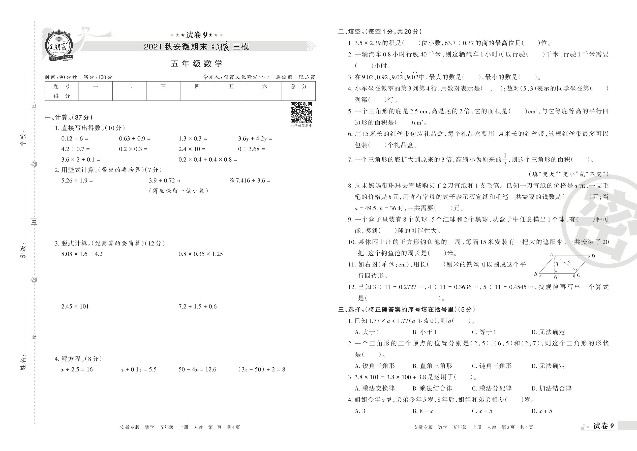 王朝霞期末模拟卷五年级上册数学(人教版)_R211223112222268【9】