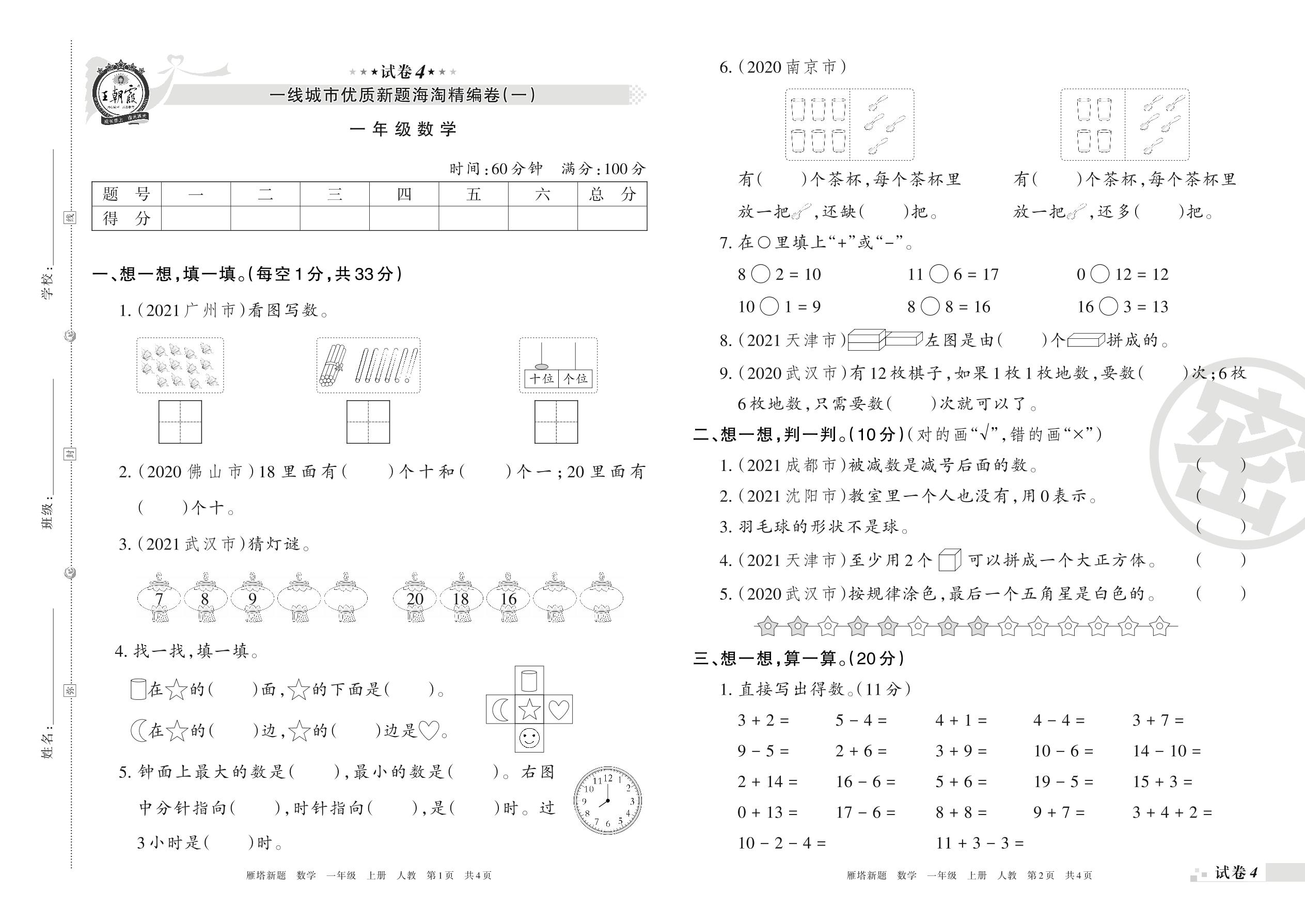 一线城市优质新题海淘精编卷(一)一年级上册数学(人教版)【4】