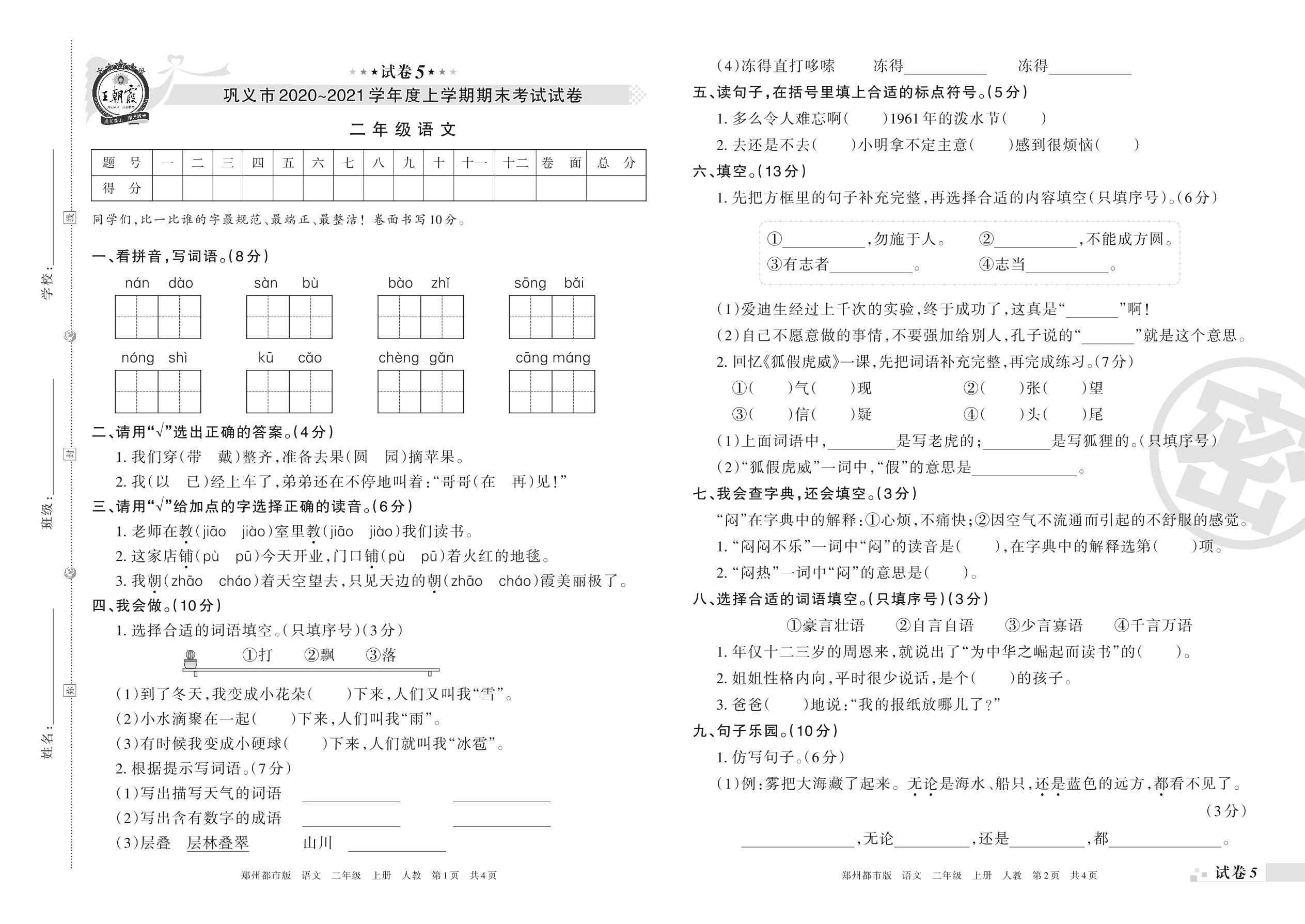 巩义市2020~2021学年度上学期期末考试试卷二年级语文(人教版)【5】
